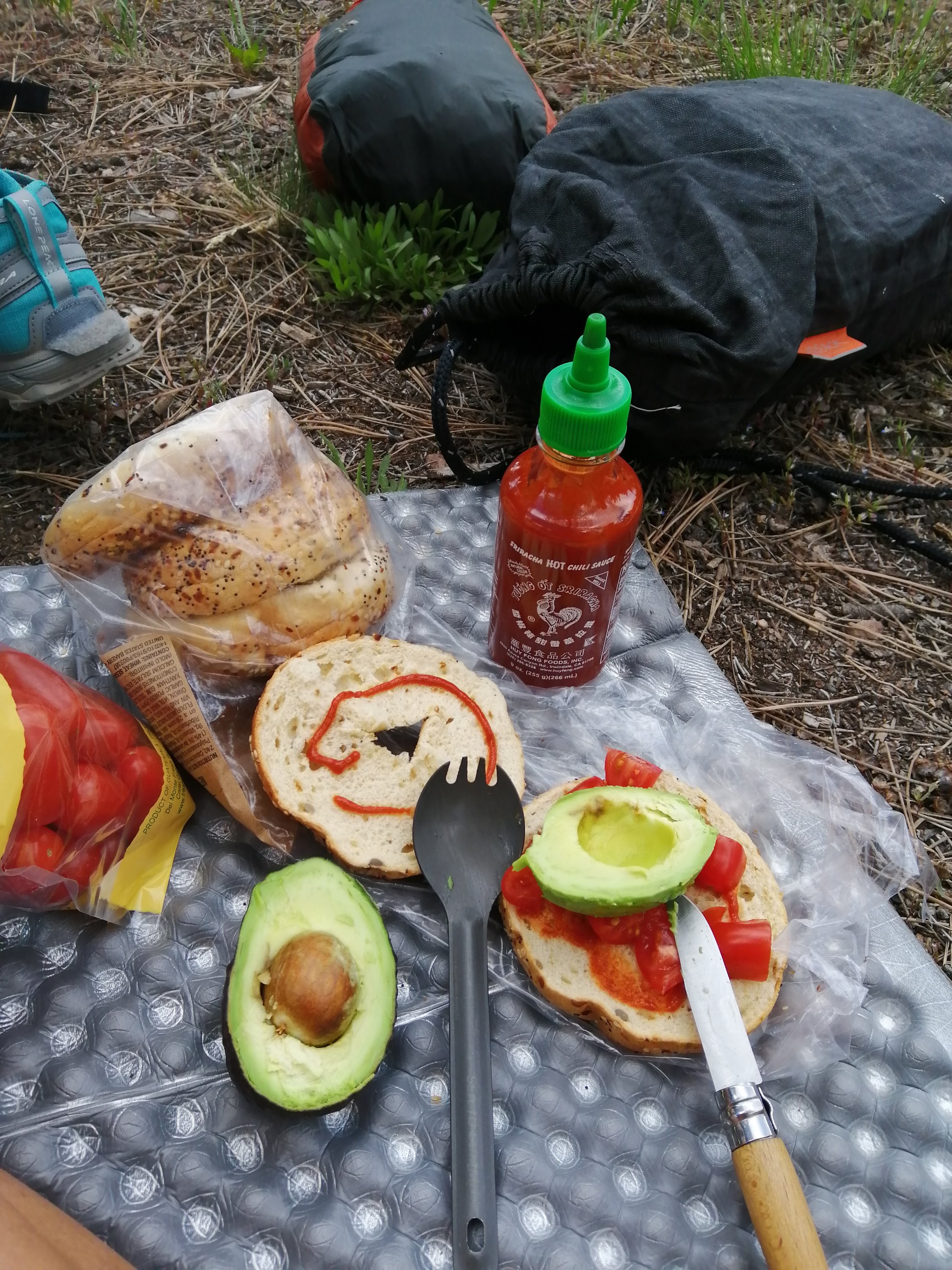 After a late start and a crappy 9 miles, before a big climb up to 3,500m we rewarded ourselves with bagels, avocado’s, cheese, hot sauce, lettuce, tomatoes. Two of the beasts. Totally unearned. Amazing.