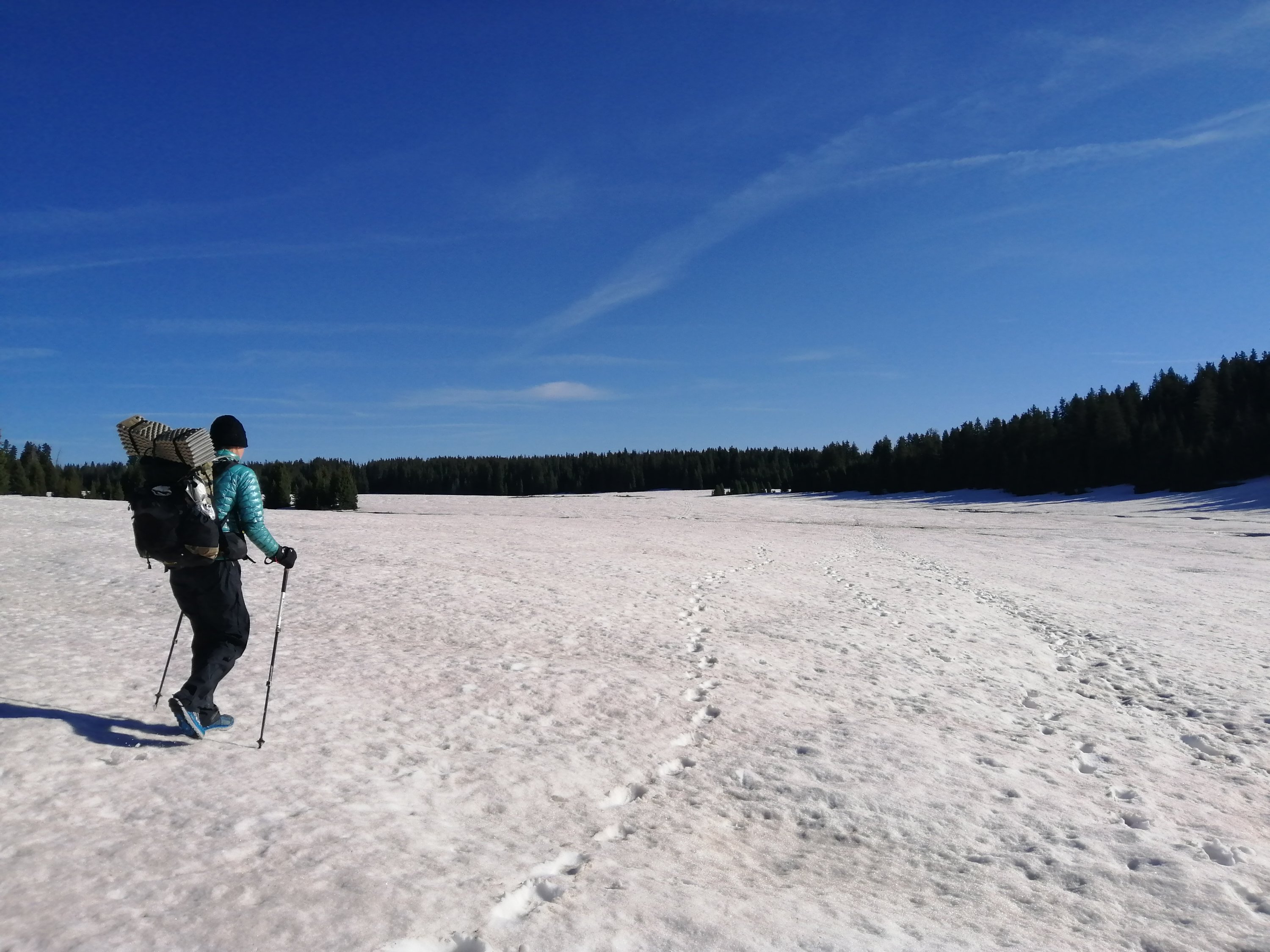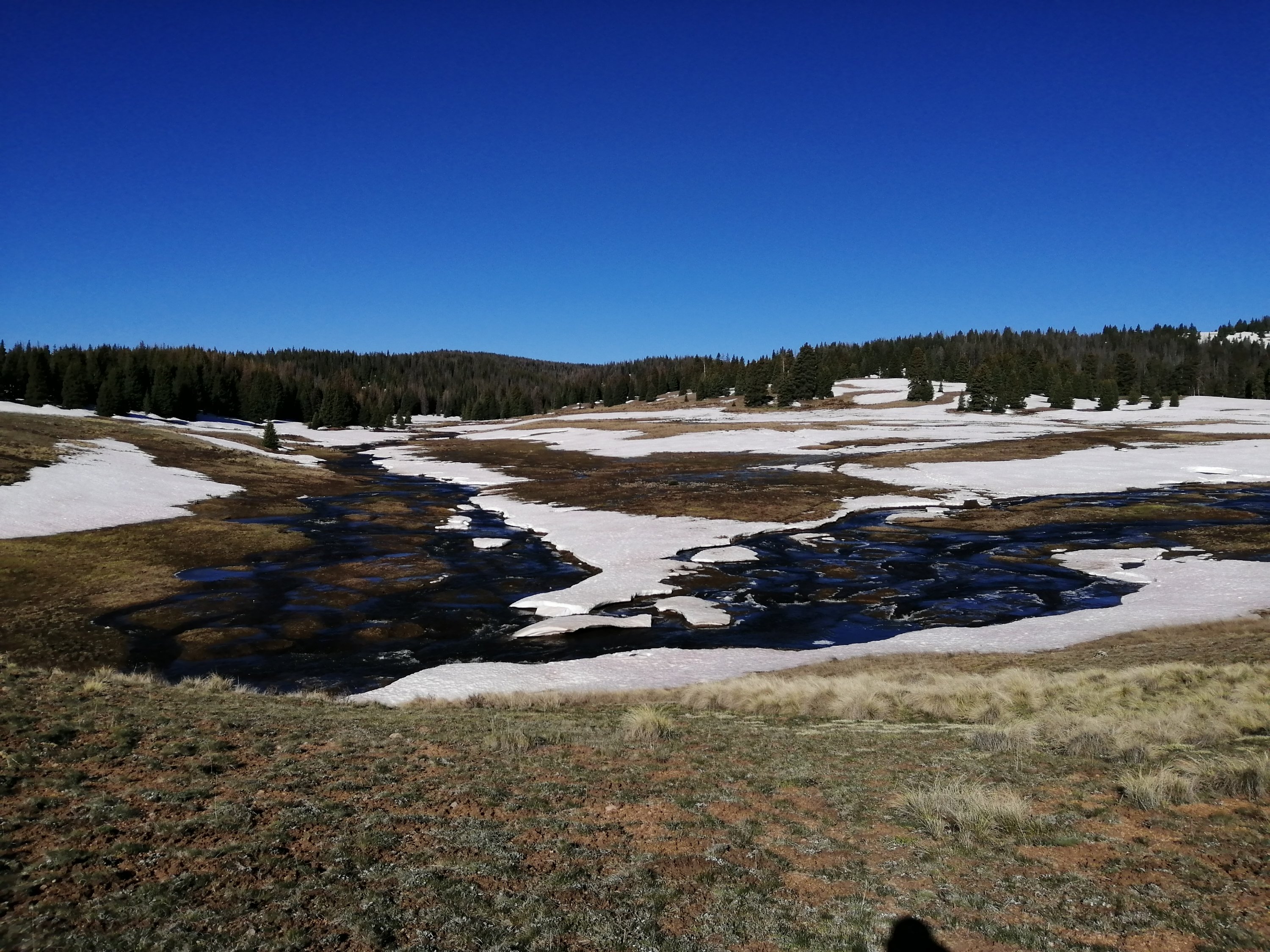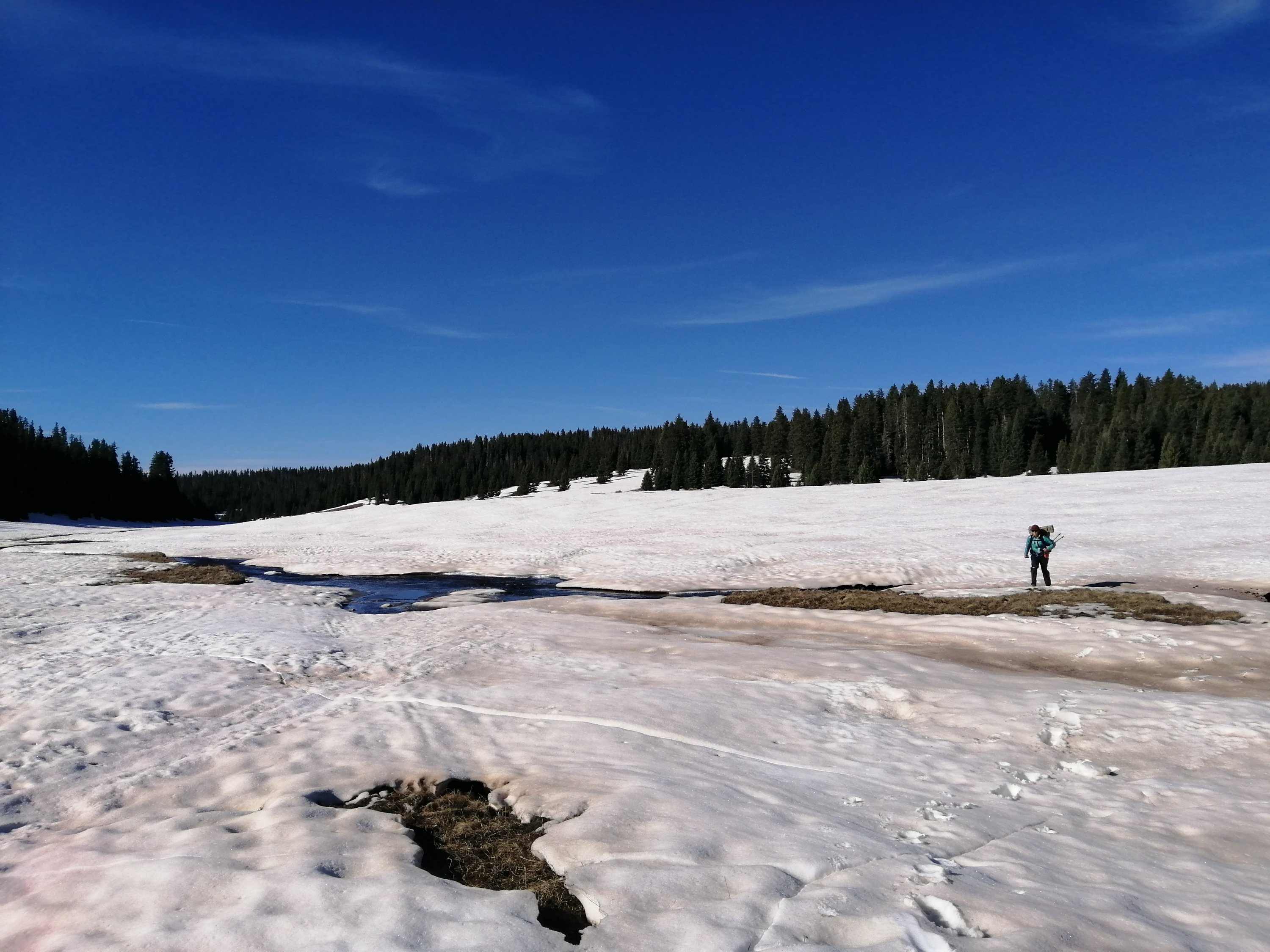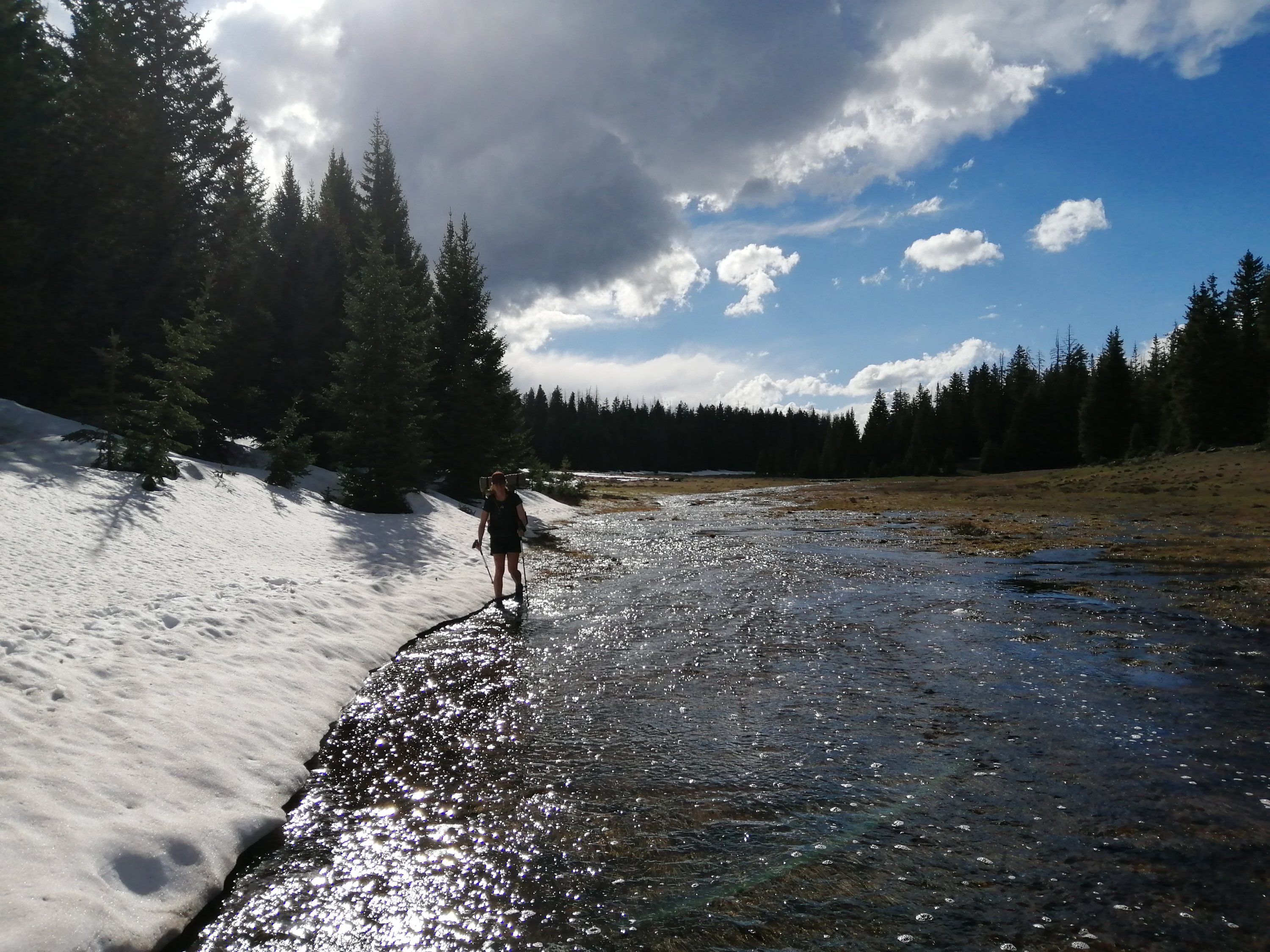 Almost back to normal we undulated through snow covered valleys and woodland. Eventually descending past the snow. I found a handy short cut, which took us to a beautiful meadow water and green grass abundant.