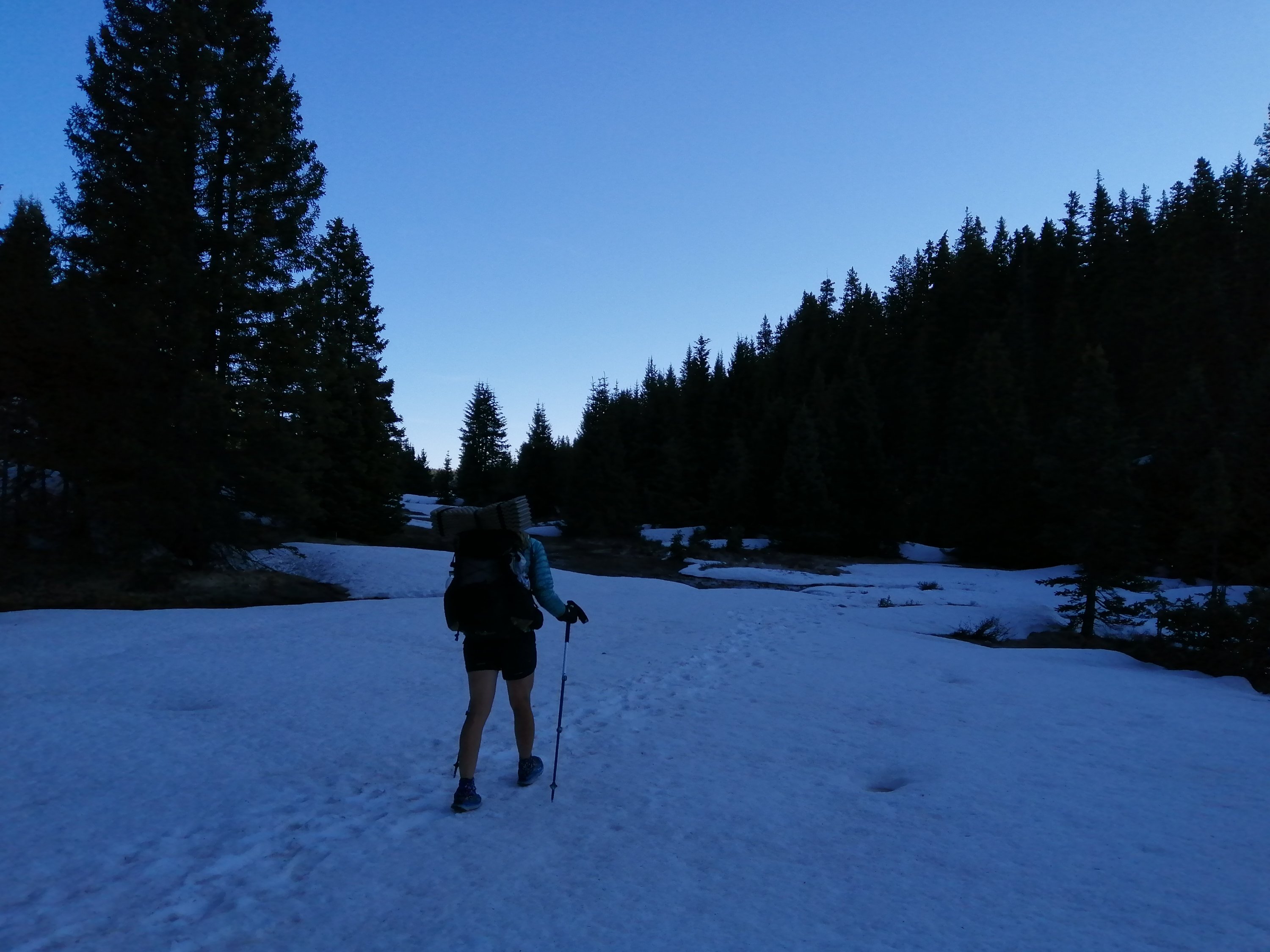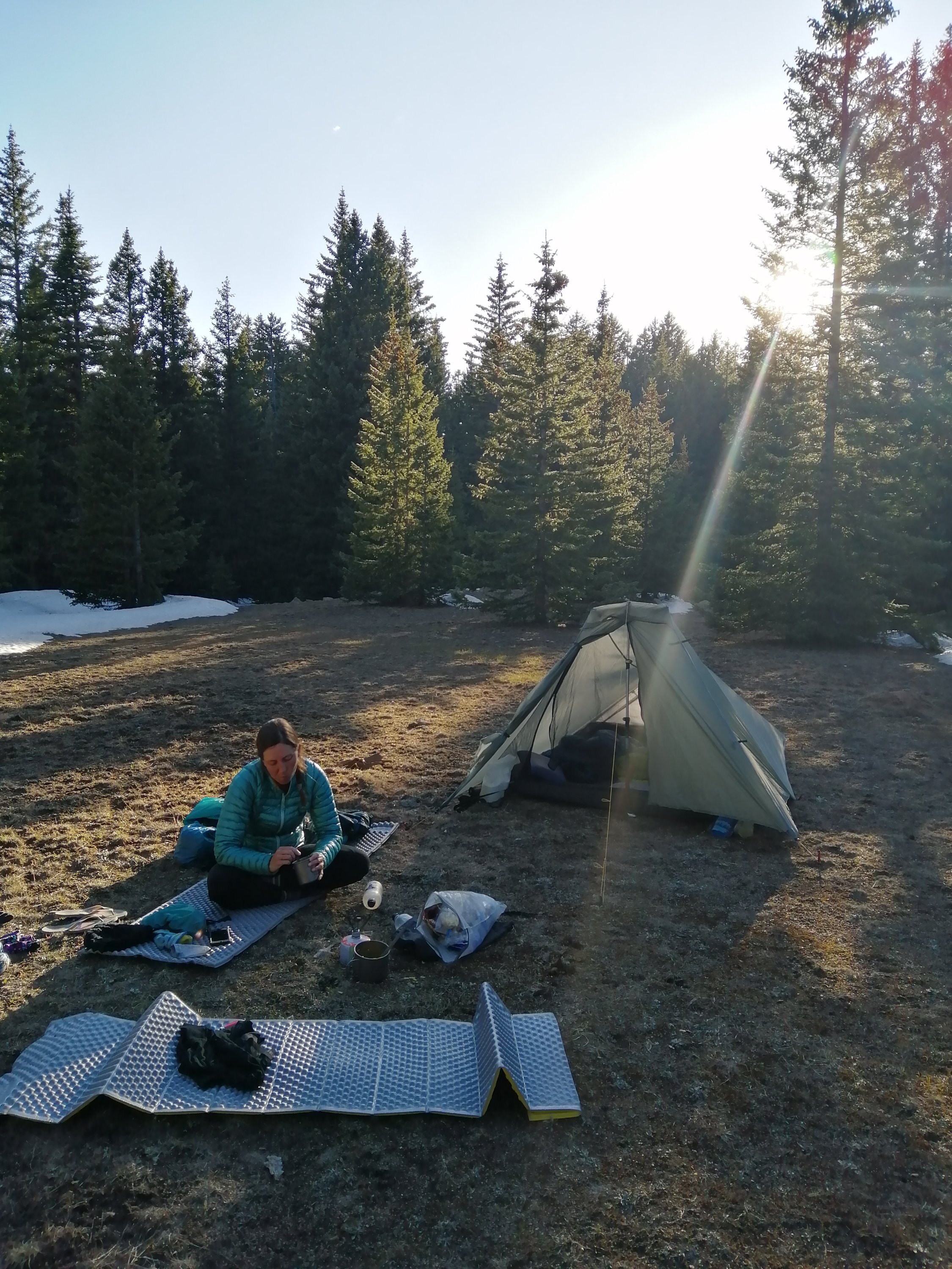 Eventually we found a flat (enough) spot in between snow patches. We ate dinner as a 4, talking big about our big town plans.