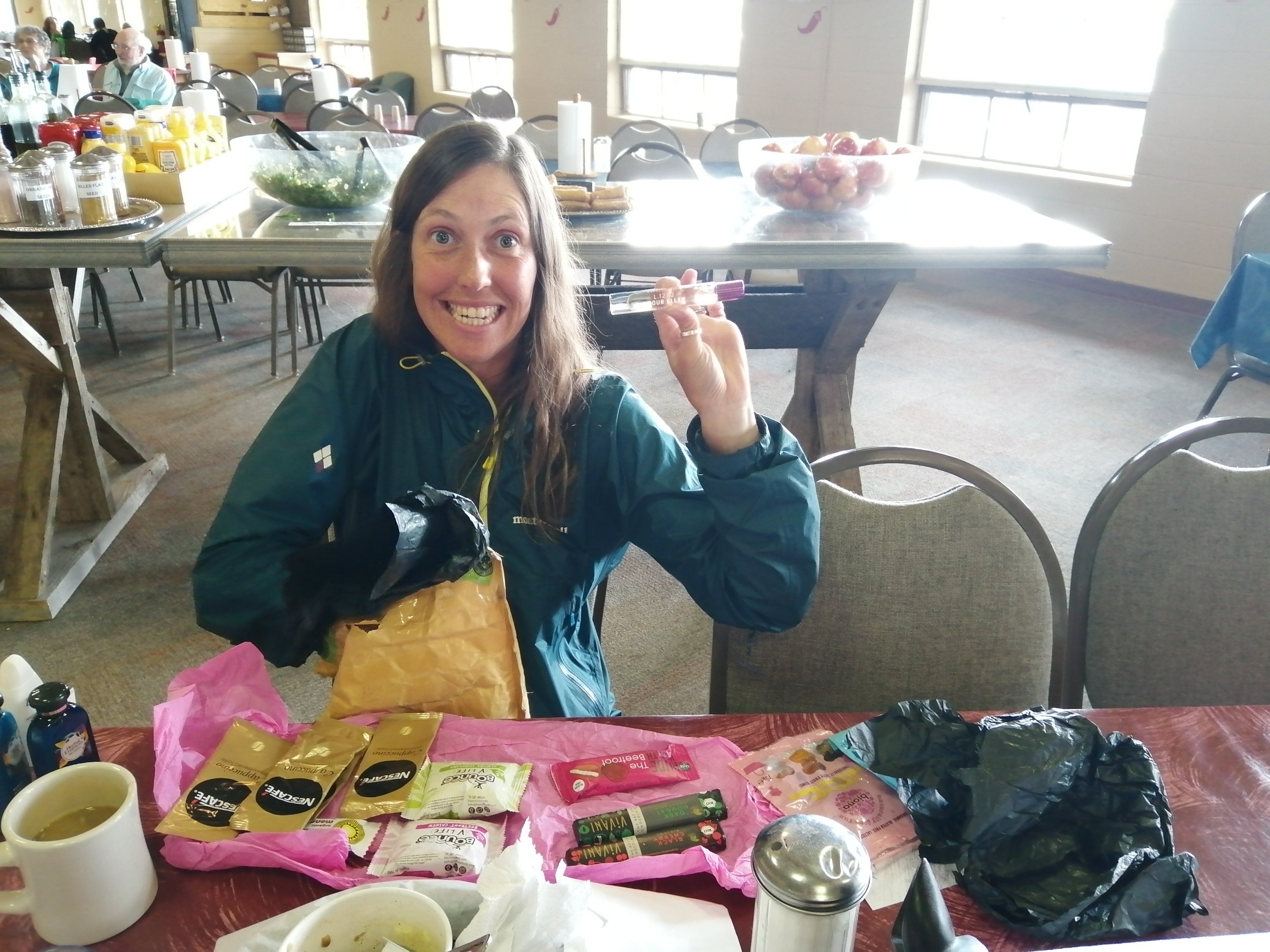 We purchased our meal tickets from the grumpy 19 year old server and asked if we could pick up our mail. Snake Legs received a new pair of socks from Darn Tough (amazing customer service on their lifetime warranty) we picked up our box of food for the next 5 days , shipped from Pie Town and an anonymous package too, with fairly illegible writing, it must be Jaqui Betts….