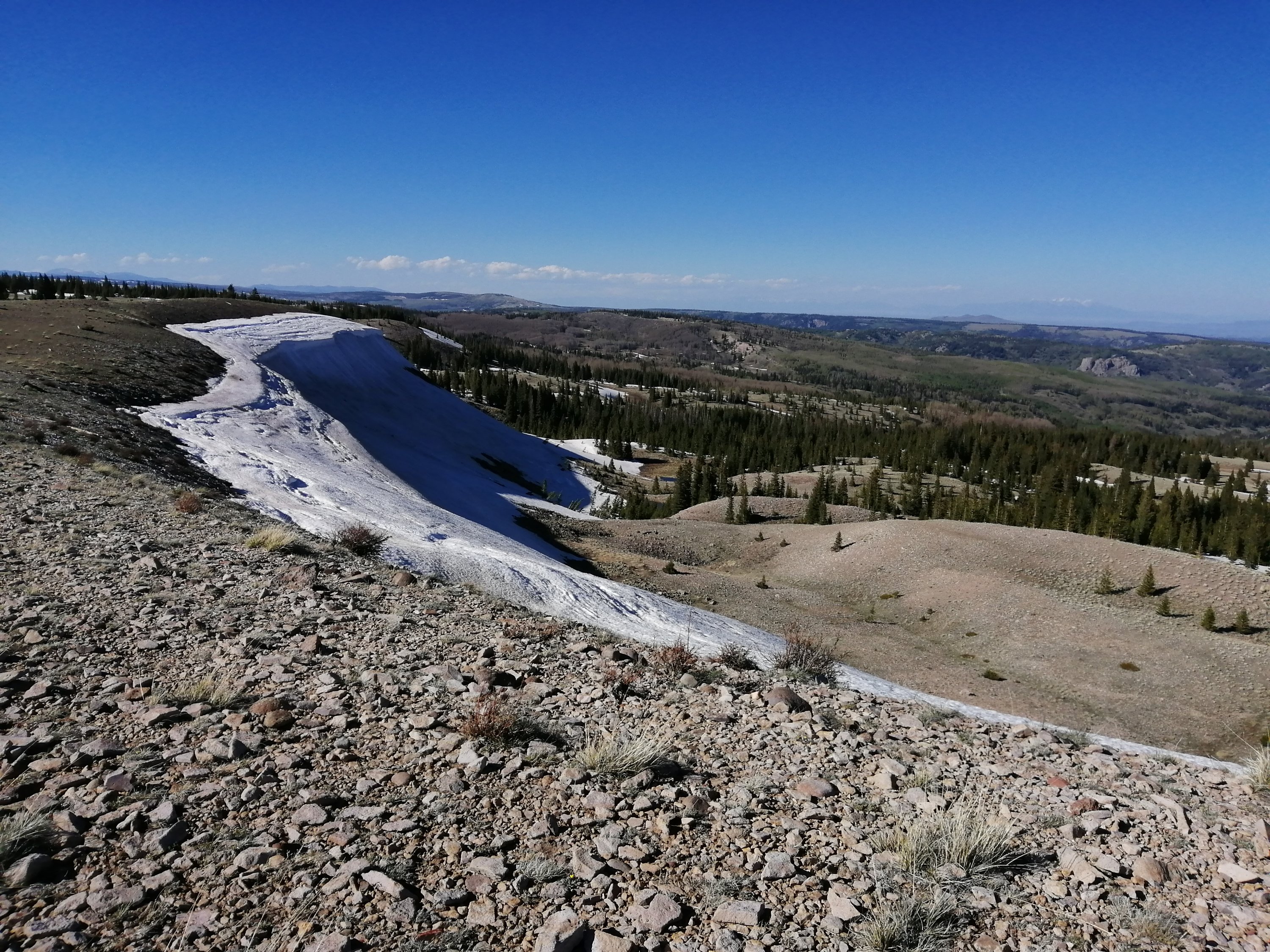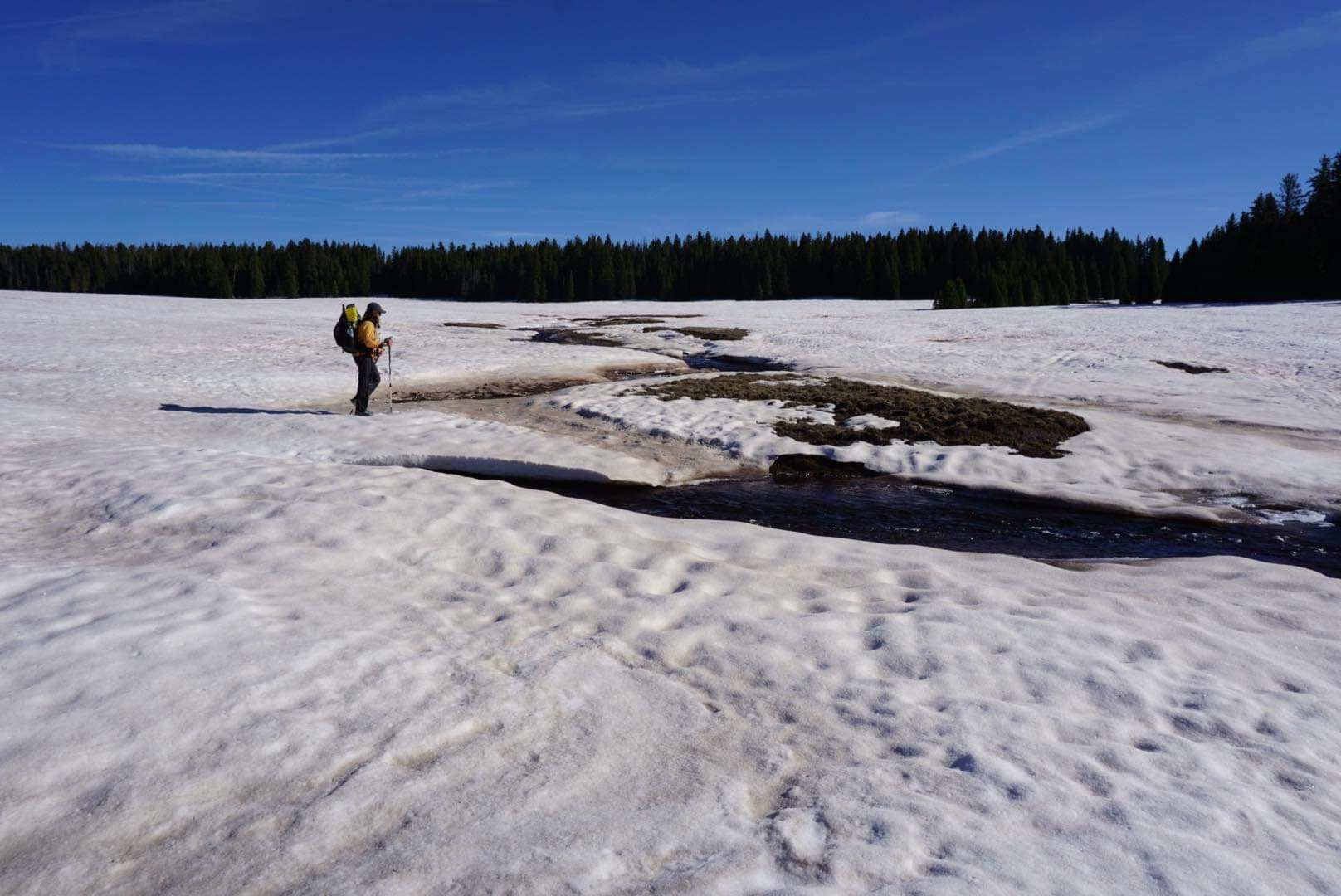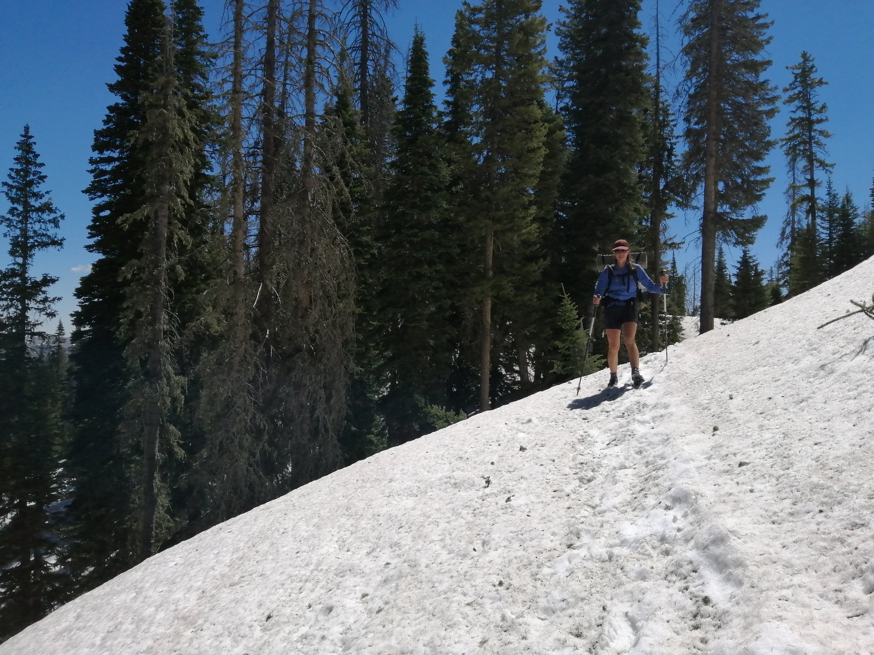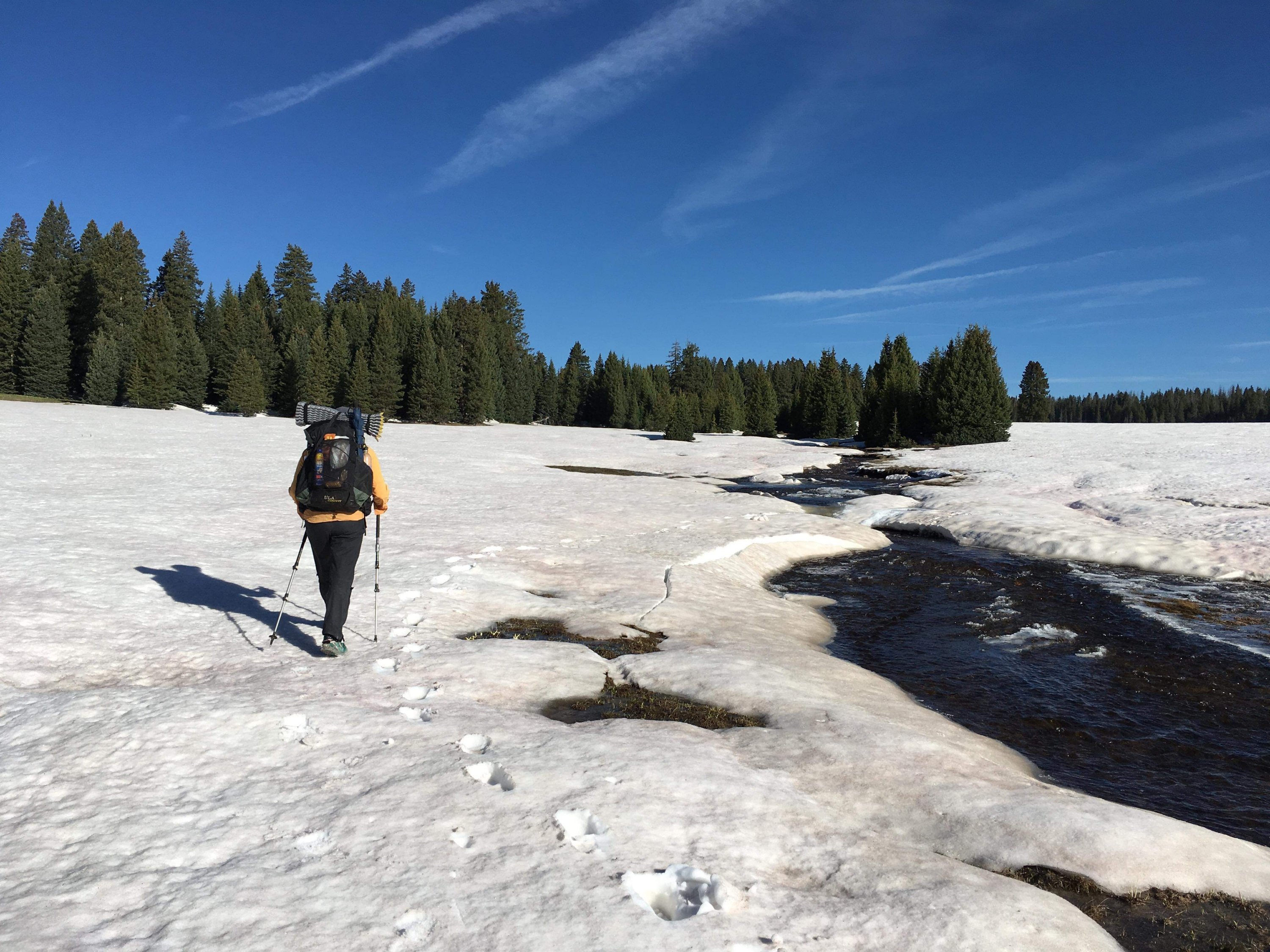 The climb was long. And involved snow and wet boggy patches. We made every effort to keep our feet dry, for two miles, which probably slowed us down a lot. After we completed the climb everything became even more beautiful and even more snowy and even more wet.