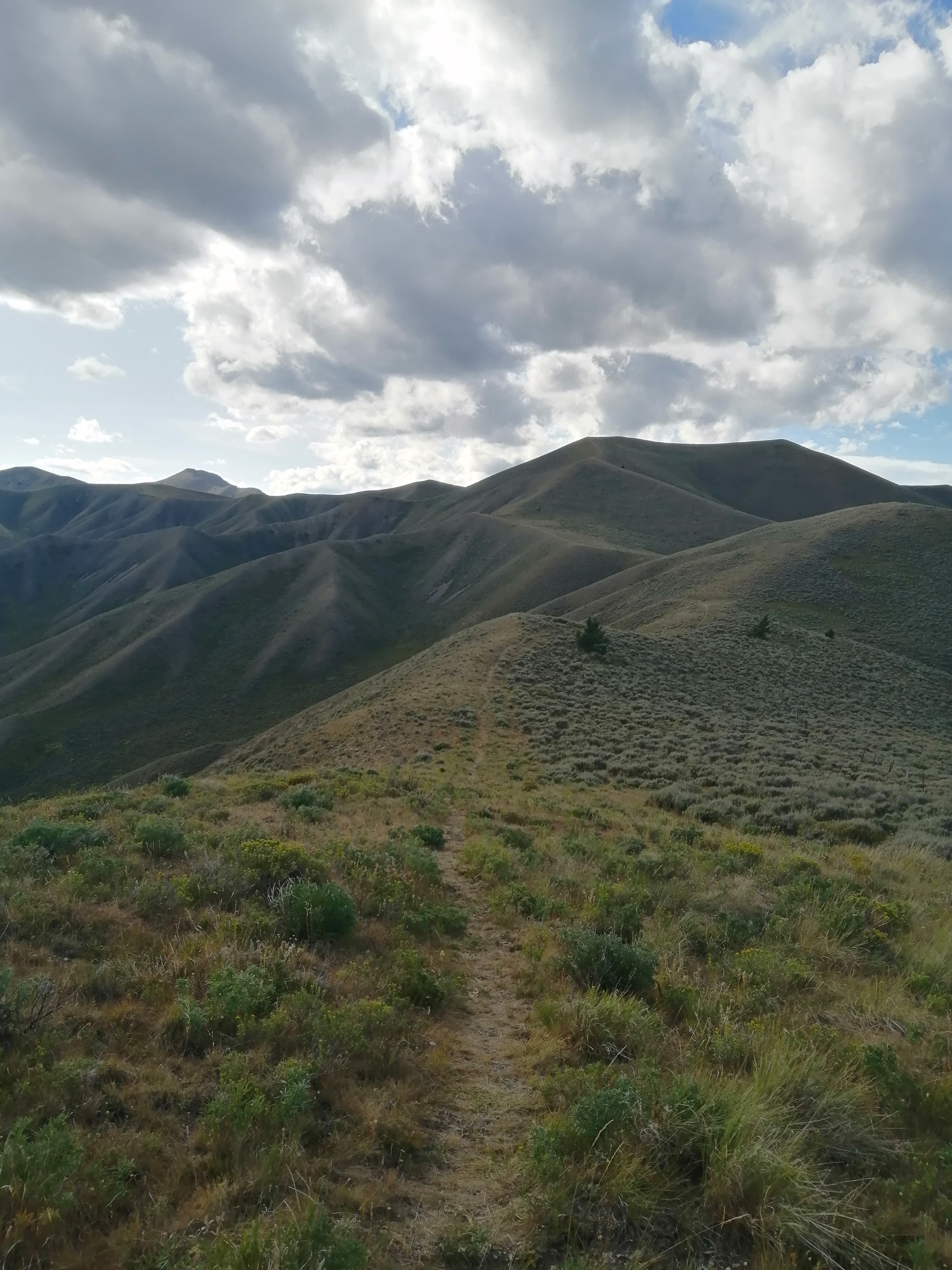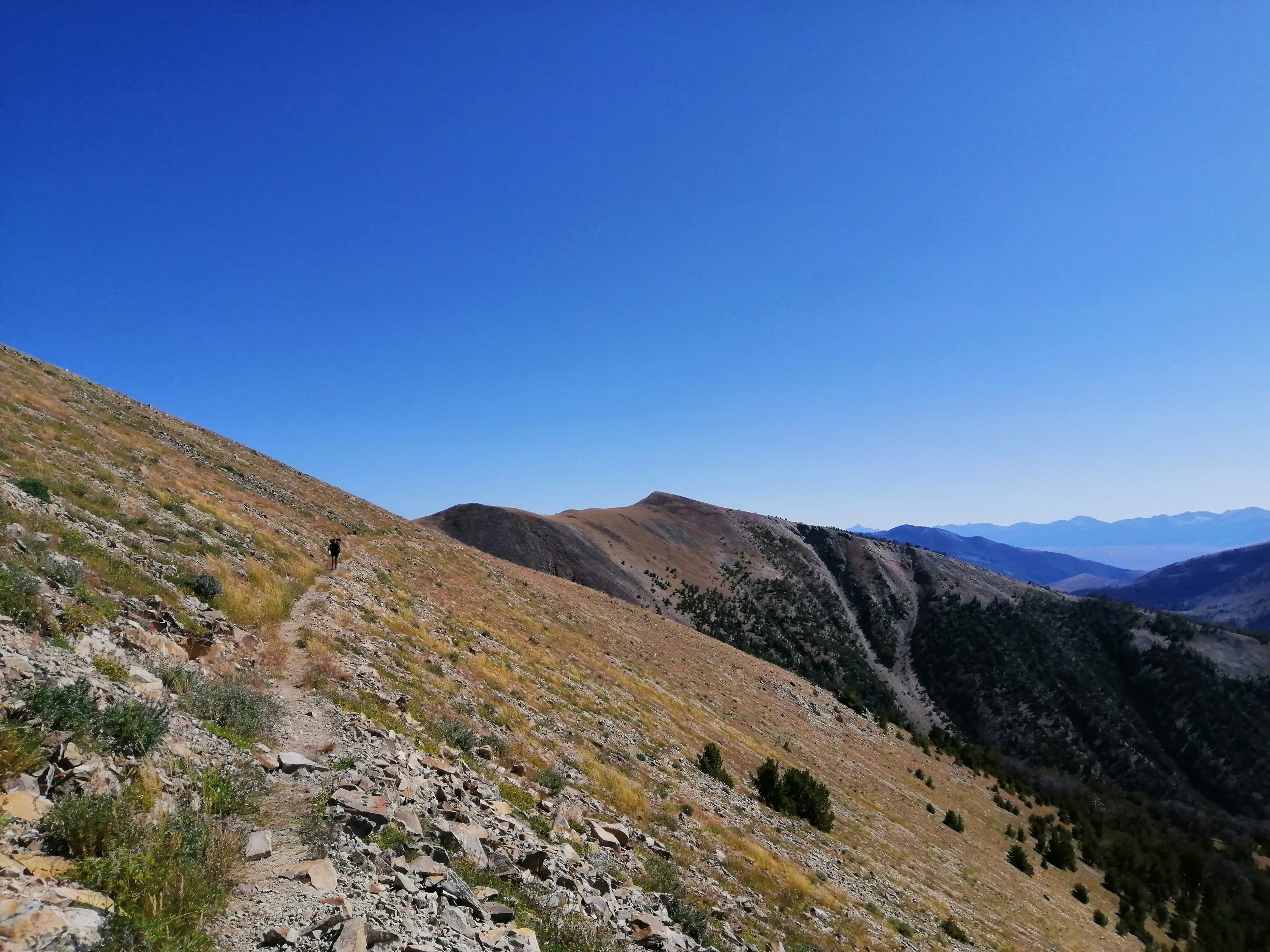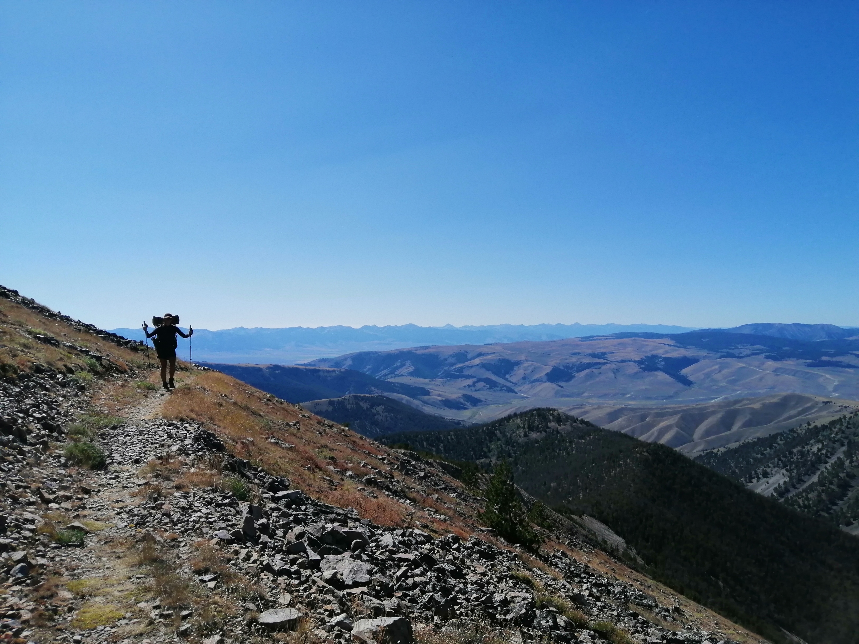 The trail turned here and began climbing up a steep hill. Once at the top we mounted the ridge which divided Montana from Idaho. We mainly stayed in Idaho because they have potatoes.