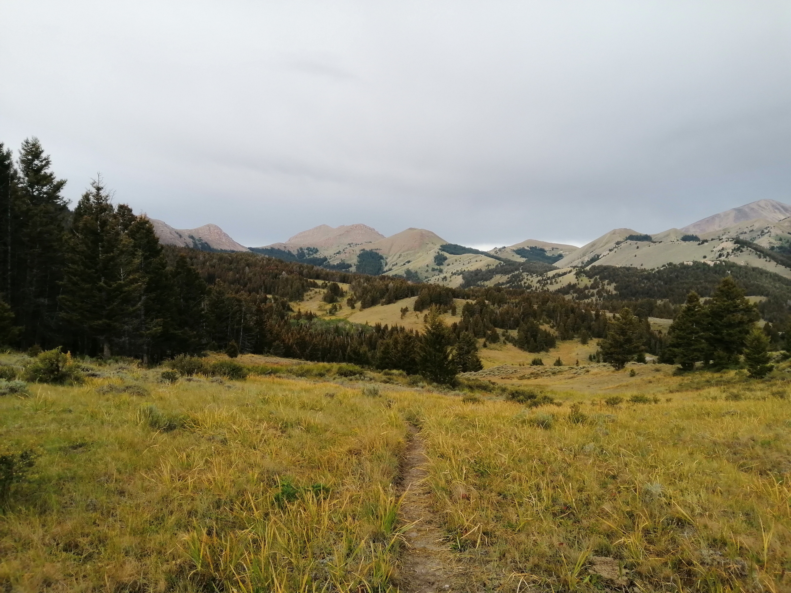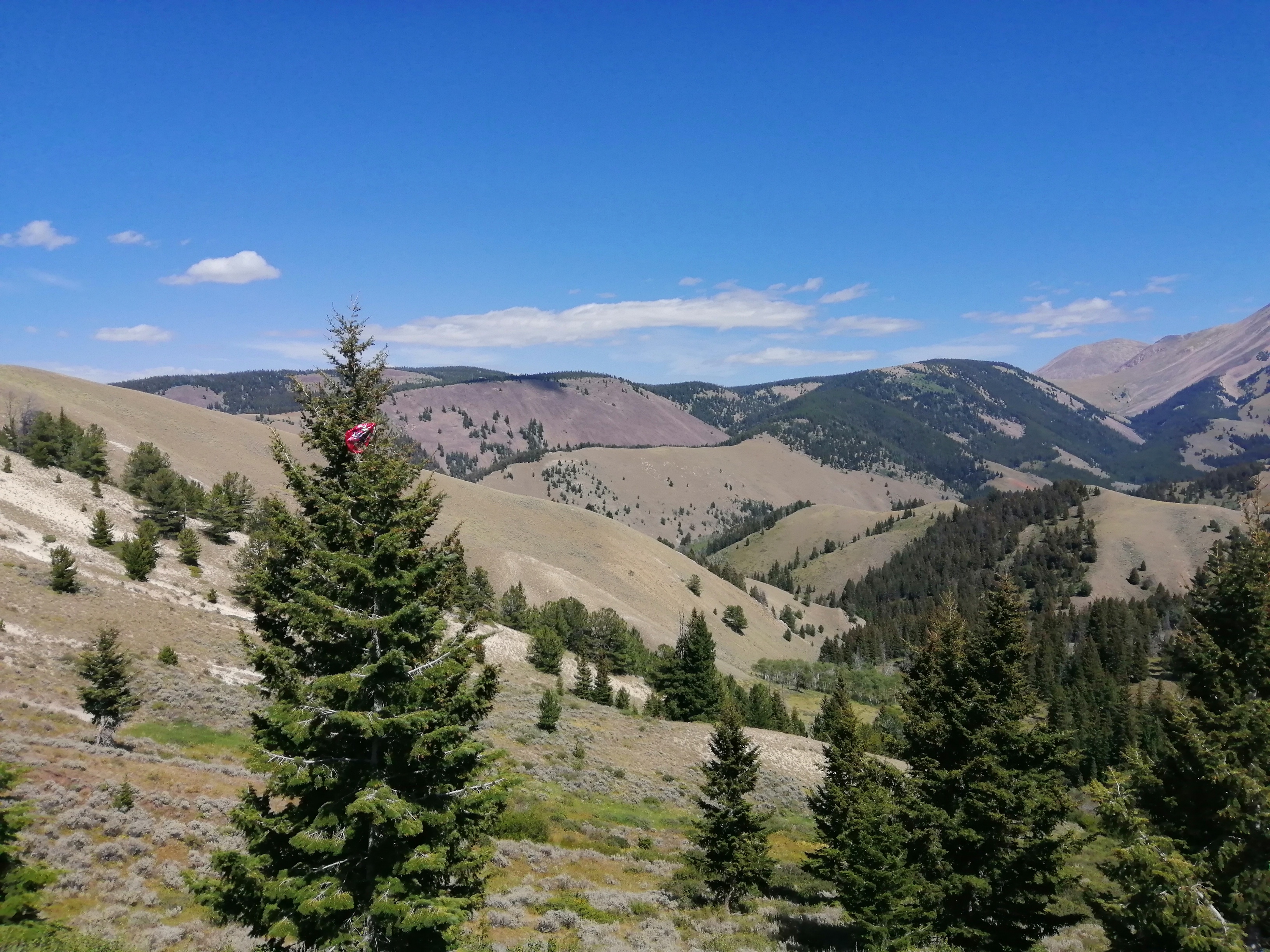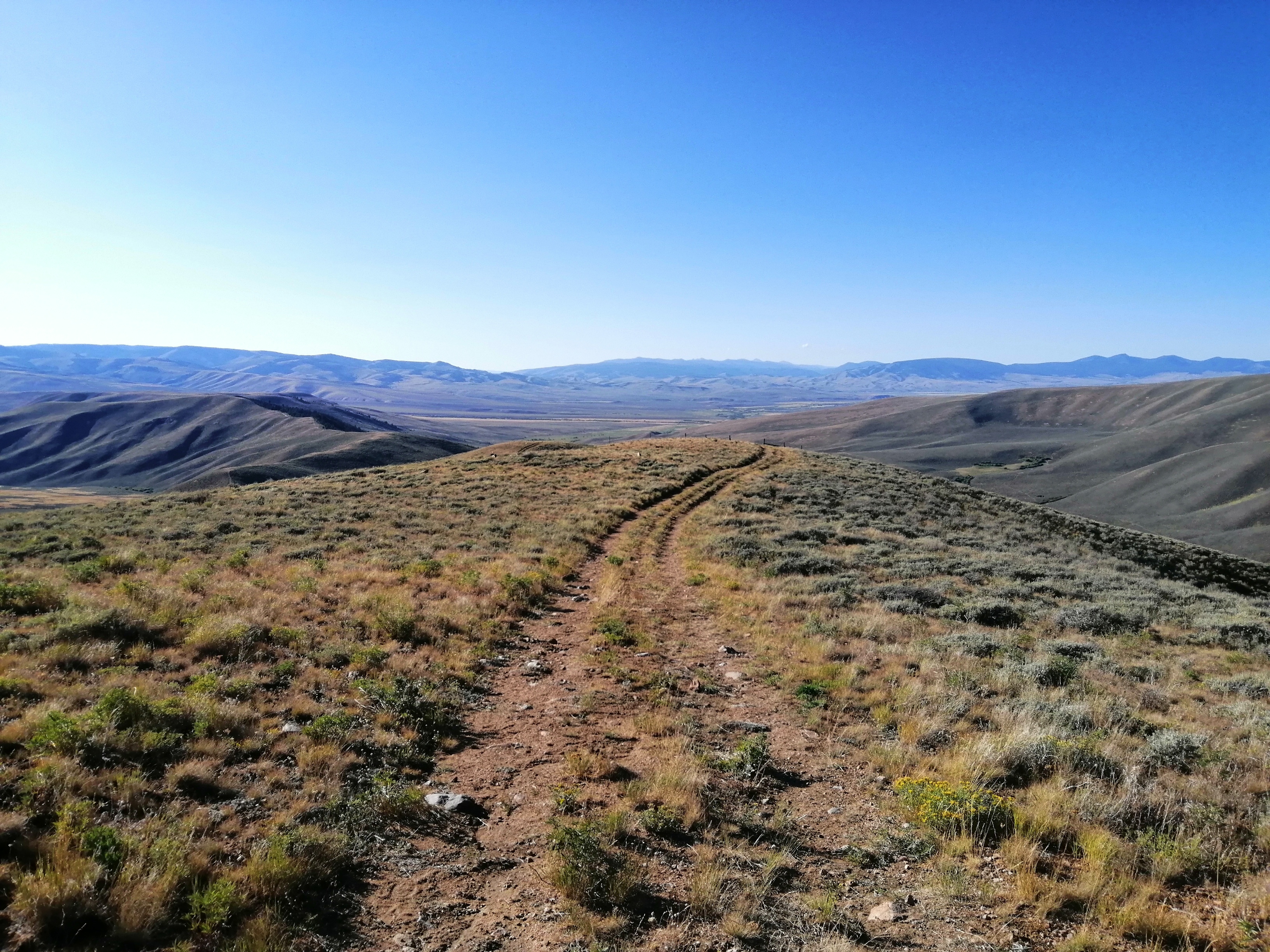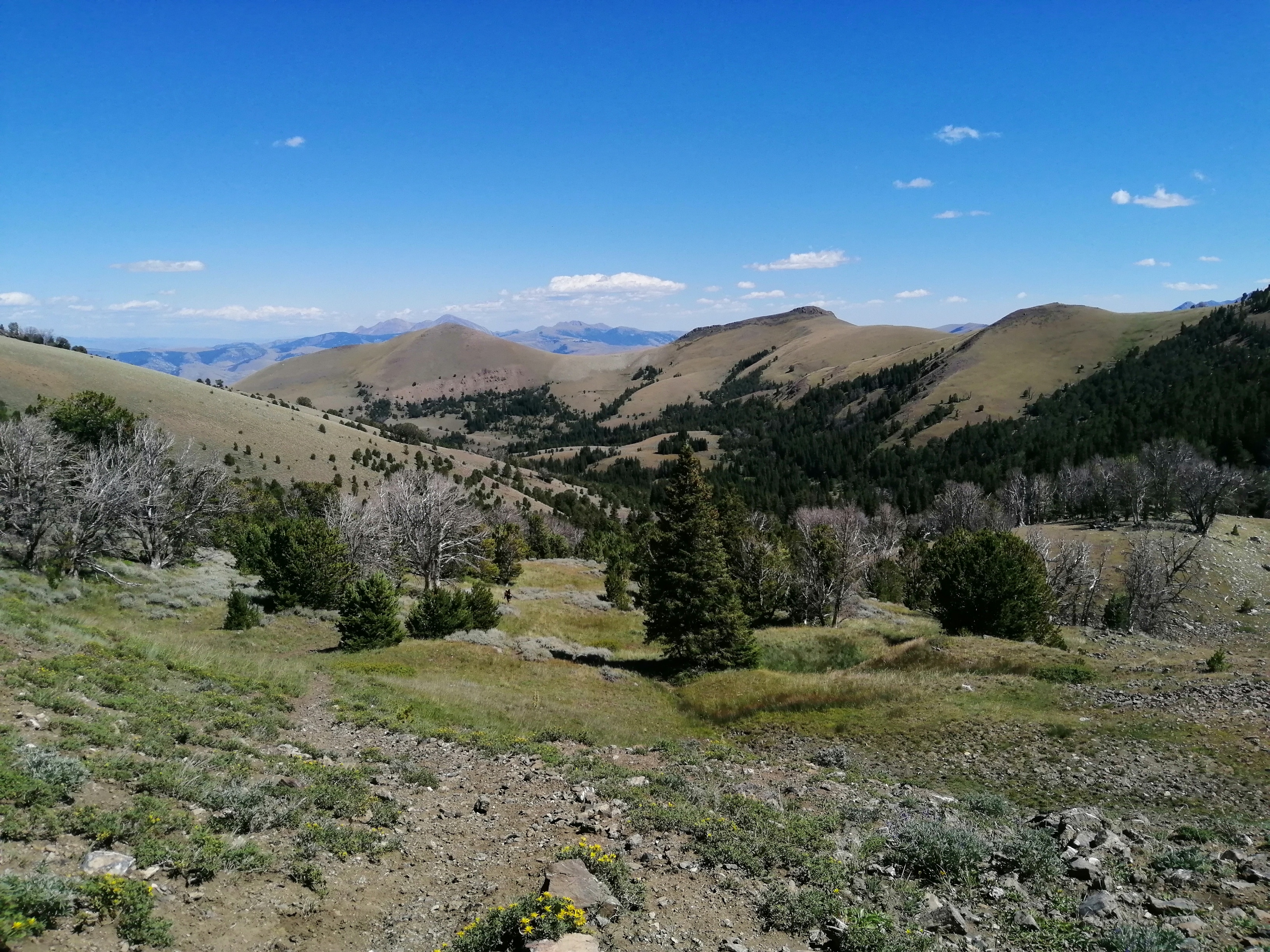 The trail turned here and began climbing up a steep hill. Once at the top we mounted the ridge which divided Montana from Idaho. We mainly stayed in Idaho because they have potatoes.