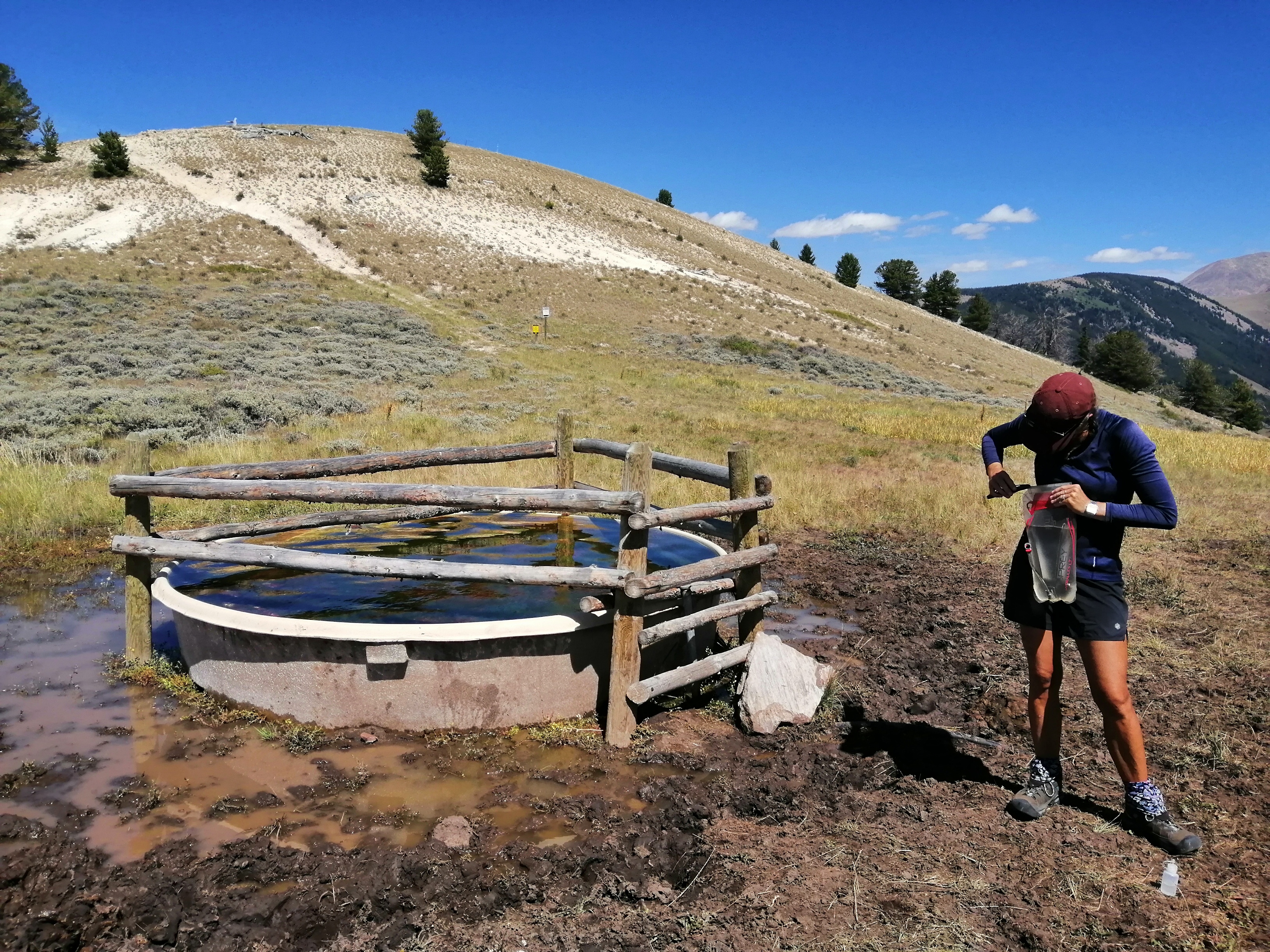 Onward and down to a saddle before climbing once again. 1.5 miles in we stopped to get water. It was my turn this time to descend 100m to a manky orange spring to collect the goods. Snakes took advantage of a moments calm. This would be the first time we’ve used our filter since New Mexico. The water came out clear but there was just to many floating particles for my liking. Baby Food passed us and passed on the water too.