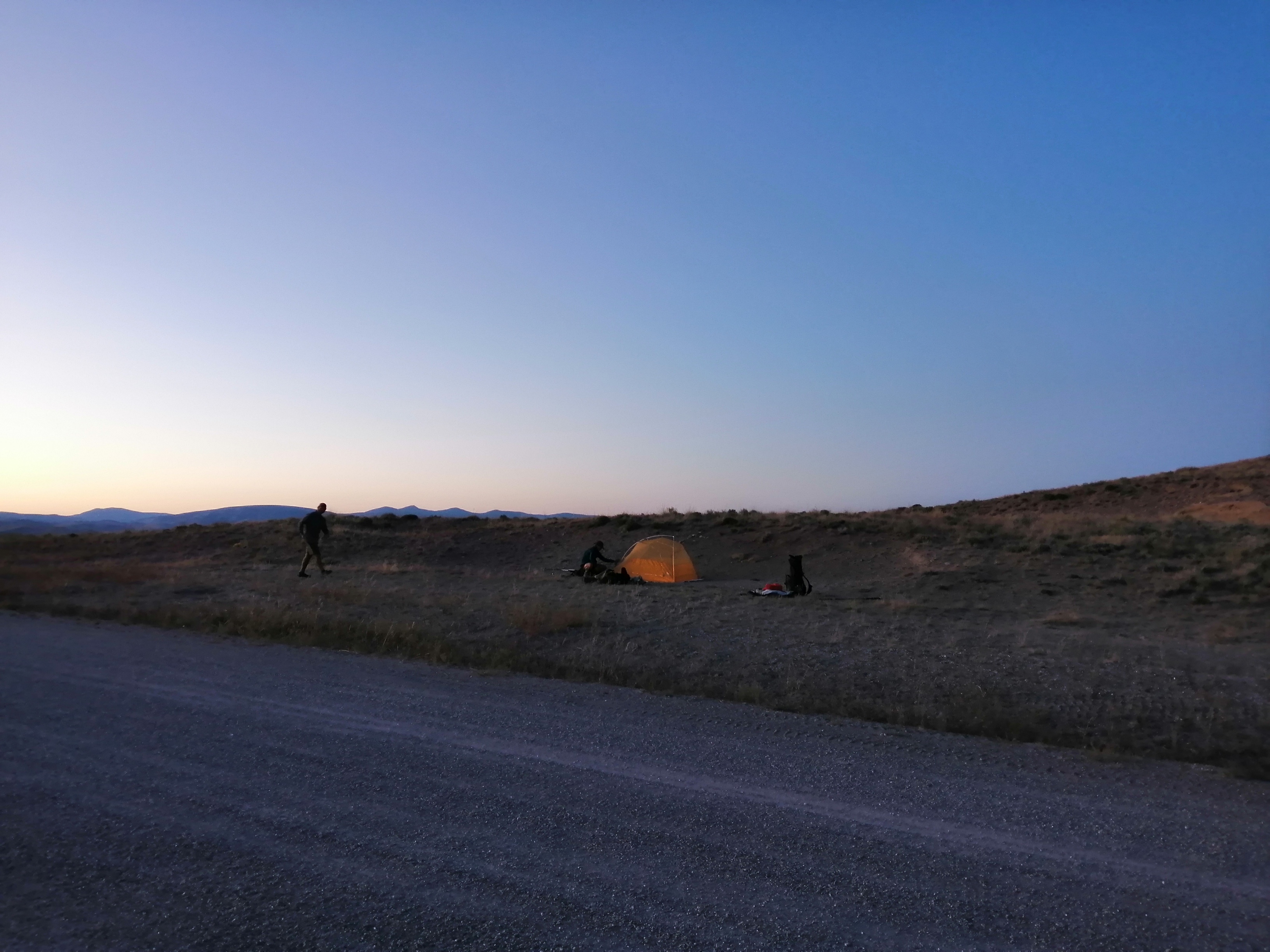 We woke to the desolate road we’d slept on. A car passed late at night and another at 6:00am. We packed up at 6:30am so to be ready to wave down anyone passing.