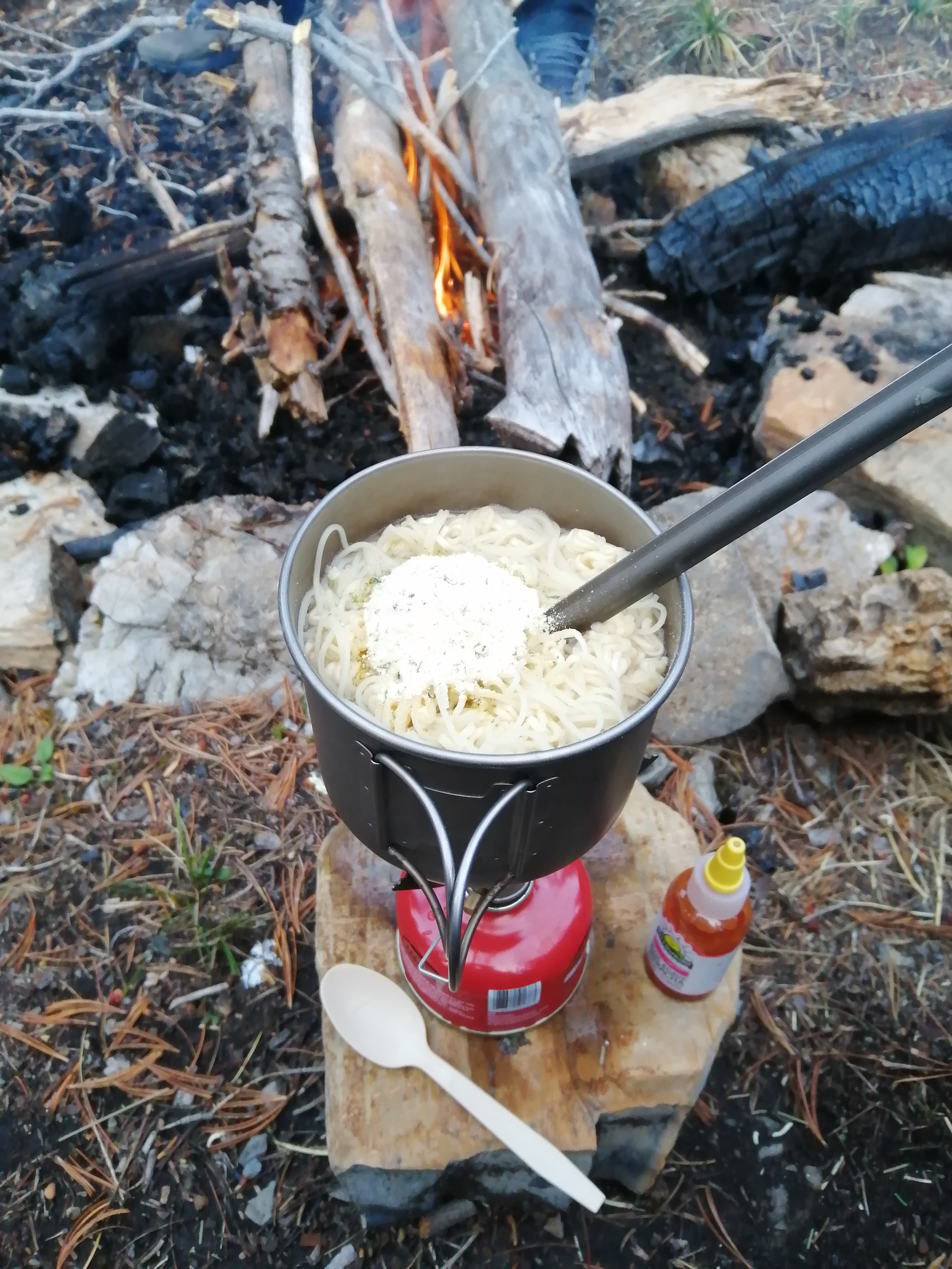 With tiredness increasing we made it to our planned 18.3 miles to a fried up lake, where, just slightly beyond, there was a spring. Snakes filled up on water while I erected the orange home. Family Size joined us and made a fire. I really enjoyed my dinner. Angel hair pasta which Snakes calls ‘hairline’ pasta. Fires are my favourite.