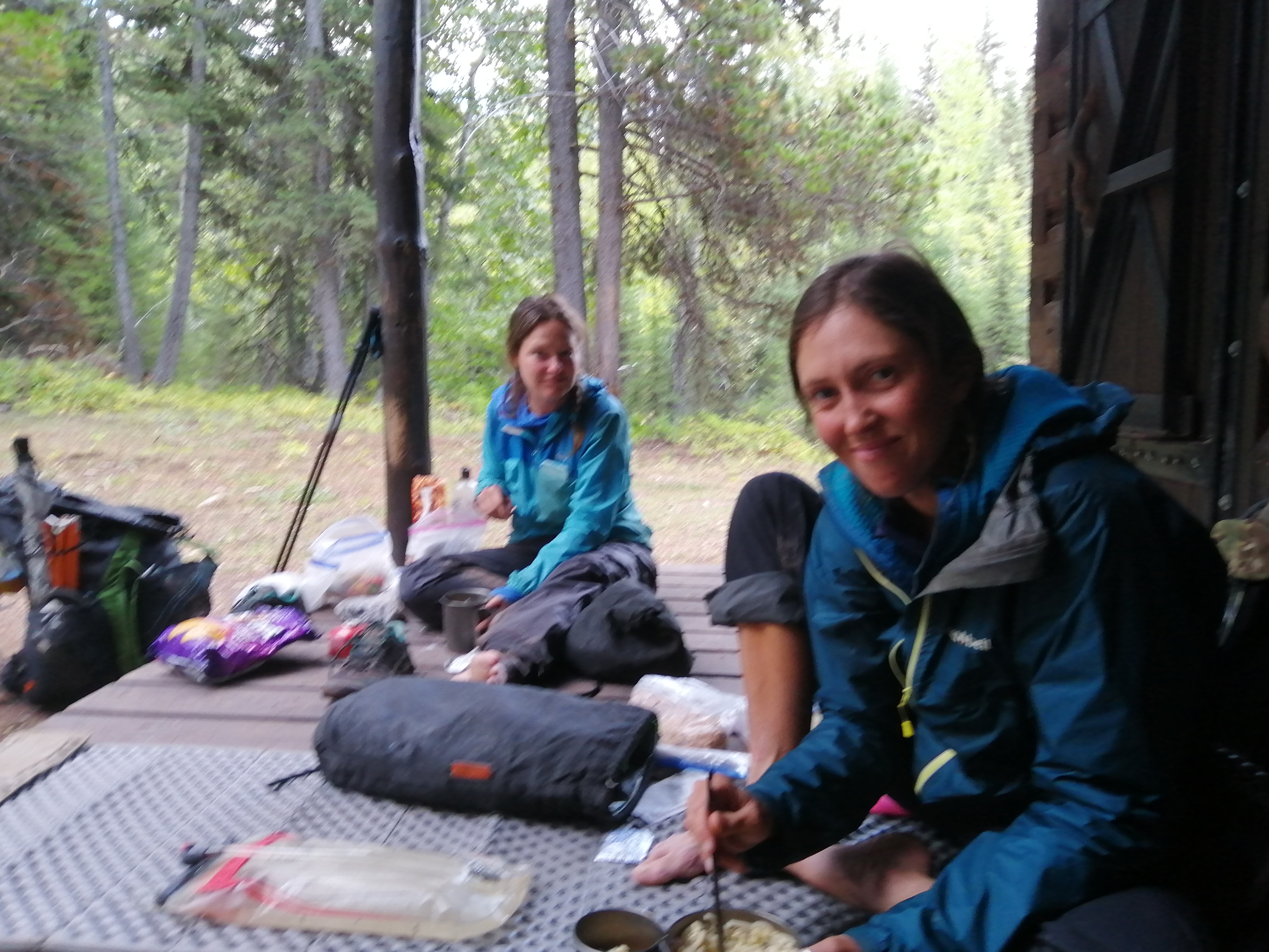 We made it to a cabin where we feasted on an early dinner as we’d agreed there was something relaxing about the porch of a cabin. The last two have both offered benches, but we still chose to sit on the floor.