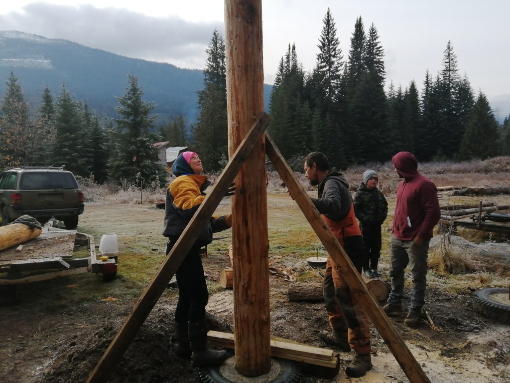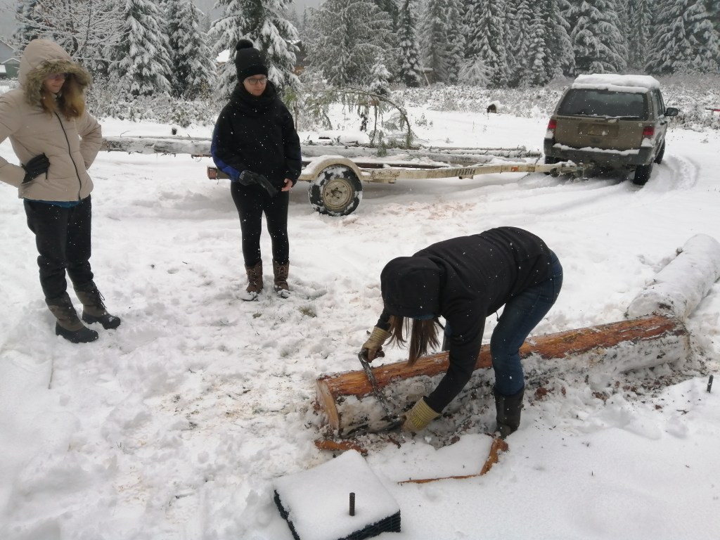 We landed at Pascal’s after a hairy drive up the mountain through the still accumulating snow. We got to work right away. Benedicte and Snakes went to work dismantling the suspension bridge before the snow collapses it, while Charlene and I peeled the newly acquired logs which Pascal had hunted for that morning.