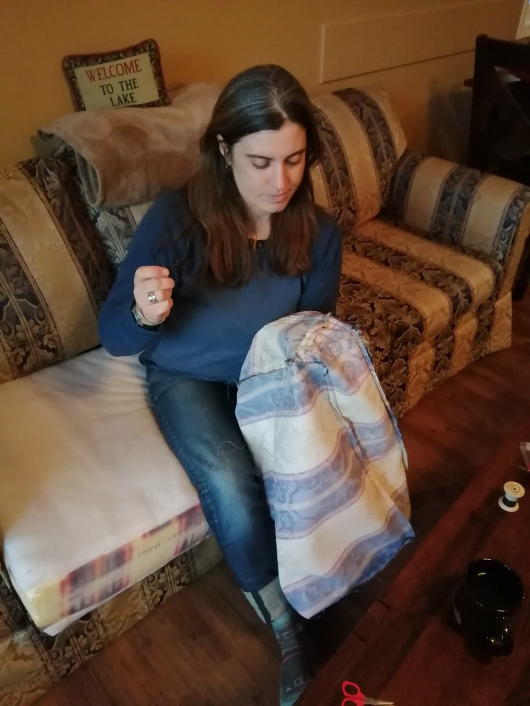 We sewed up some sofa cushions in the suits which were on the brink of ripping and I must say, my sewing skills are much better than you think they are. I did get an ‘A’ grade in textiles at GCSE, or, my mum got me an ‘A’, one of the two.