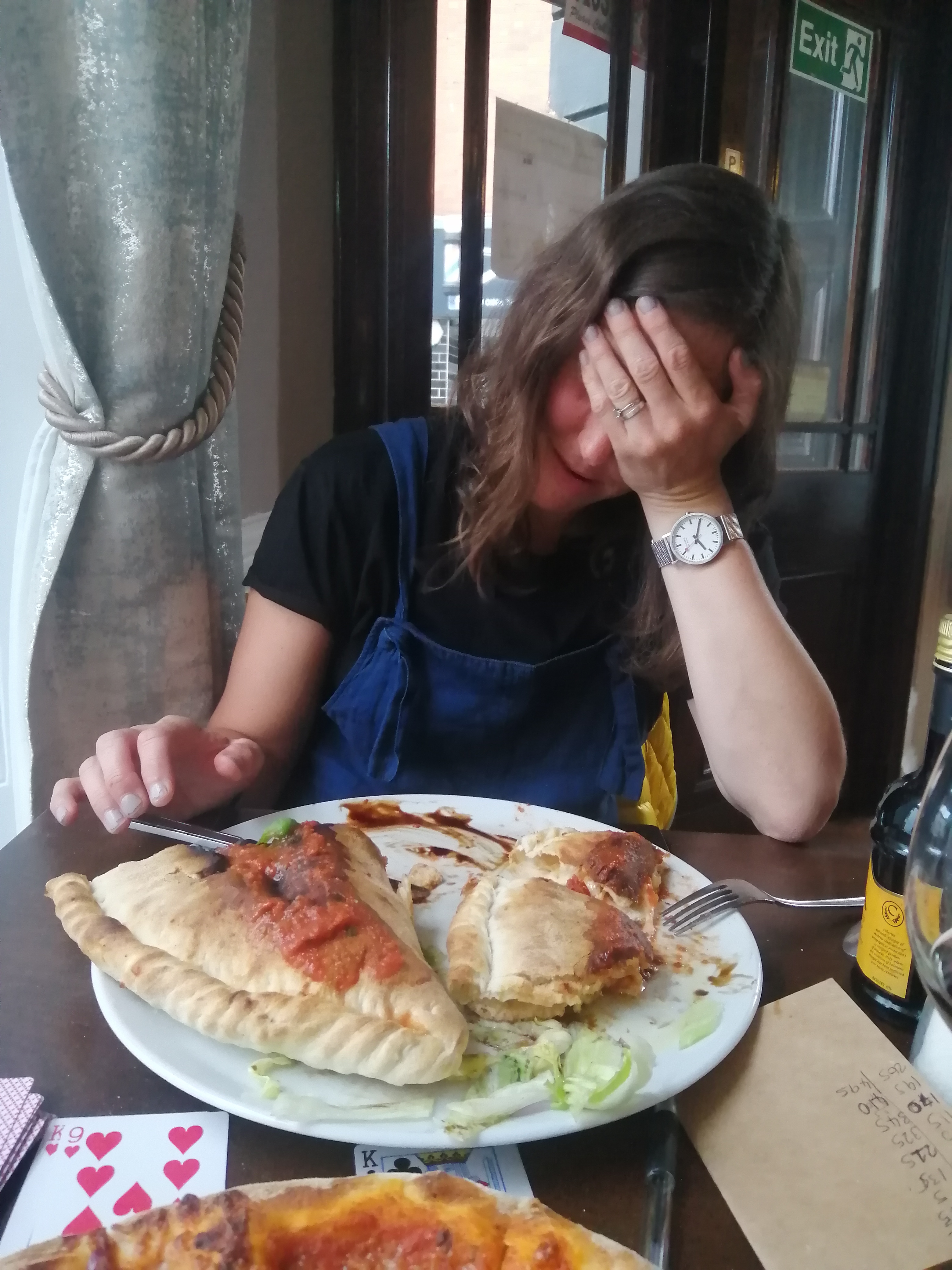 We popped off to the local Italian which was swelteringly hot inside but much to my delight, served massive portions of food. Shelley kicked my butt at rummie and I didn’t finish my pizza. Miracles occurring, every day.