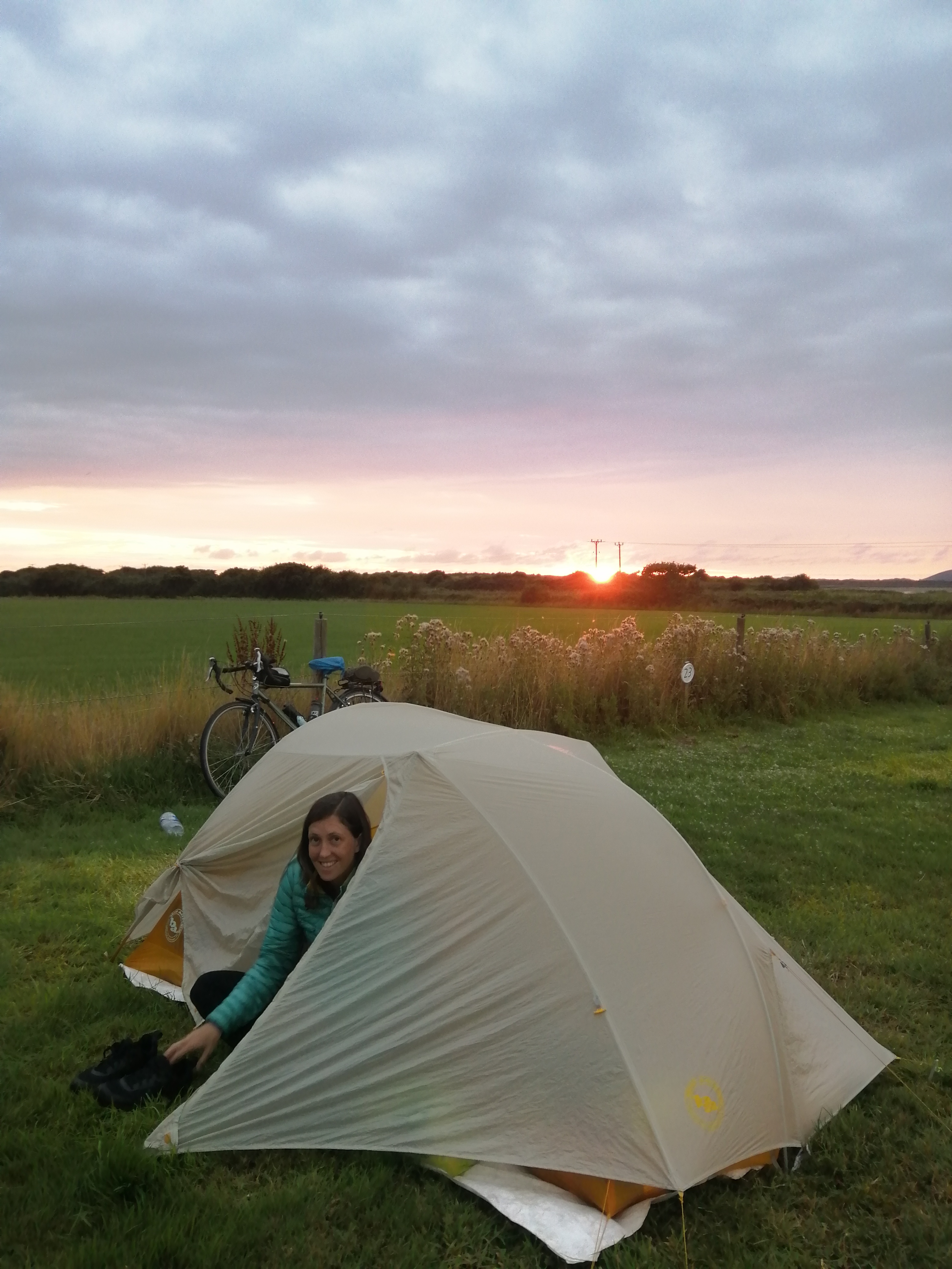 We woke to grey clouds, but with a warm breeze off the estuary. The cyclist in the tent next to us was packing up and departing early, but not before giving us a bag of giant Wotsits he decided he no longer wanted. What a great start to the day.