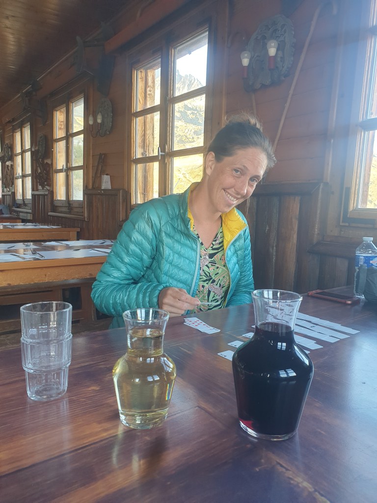 Back to the refuge to hand wash my pants, write this little entry, play cards, drink wine and watch from afar as one man decided to set up his tent a single metre away from ours, turning down the alternative option of literally anywhere else. We sat with a group of 3 Americans at dinner and feasted on a 4 course meal of salad, tartiflette, cheese board and chocolate mouse, with additional bread which, on any other day would be problematically stale, but today, as hungry as I was, it was practically fresh.