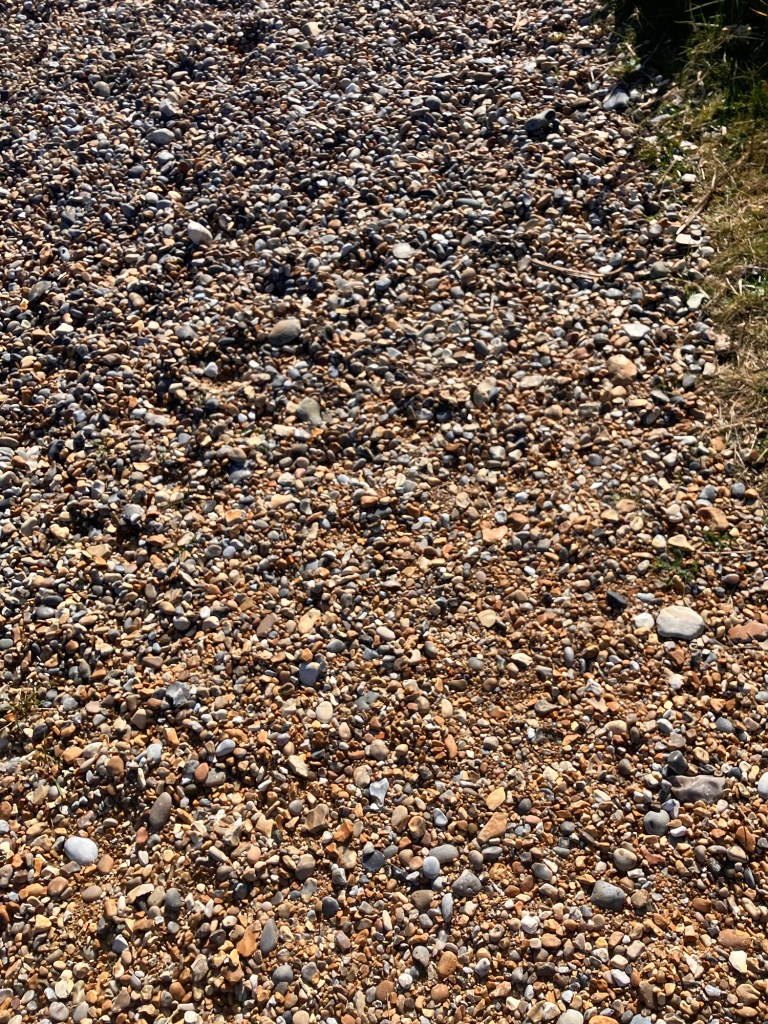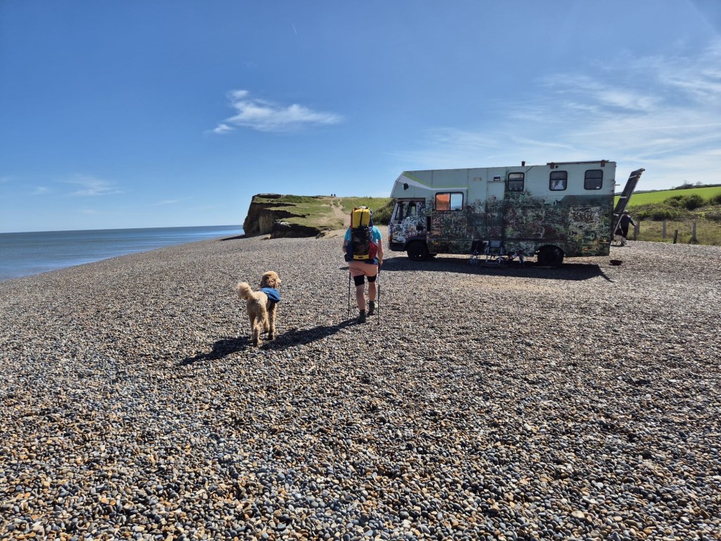 The day was immediately warm. We marched back to the sea on little cut-through lanes and footpaths. We were there in a couple of miles and found the trail. Frome here it was a good few miles of hard work pebble beach. We started out and the going was tough. Our big heavy packs constantly helping sink us in to the beach and driving our feet back on every step was calf burning. We made it a mile or so then noticed a detour, longer in distance but on solid ground, so likely quicker. We opted for that and made fairly quick work of it, we also gained height and so had a nice view of the sea.