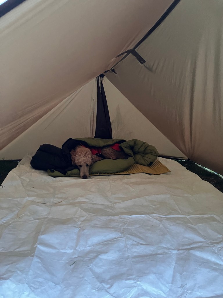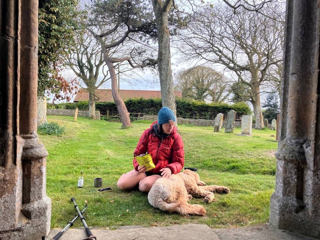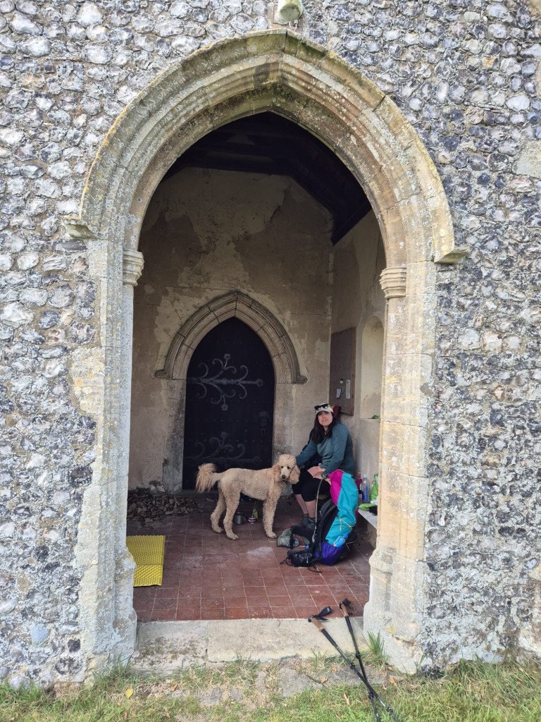 We peeled off in the lovely village of Overstrand and went to the village shop for a tin of fish to supplement Eric’s dinner. While we were there we made the most of the tiny wines on offer too. We managed to bypass the pub, though Eric pulled to go into it, as well as pulling to go into the chip shop- and struck back out into the coast path and cliff tops. We meandered in and out between crop and drop on a windy section of trail, aiming for the distant church at Trimingham. Before spilling out into the church we passed a lovely and perfect woodland to camp in. This is usually a bad omen meaning we won’t get so lucky further along.