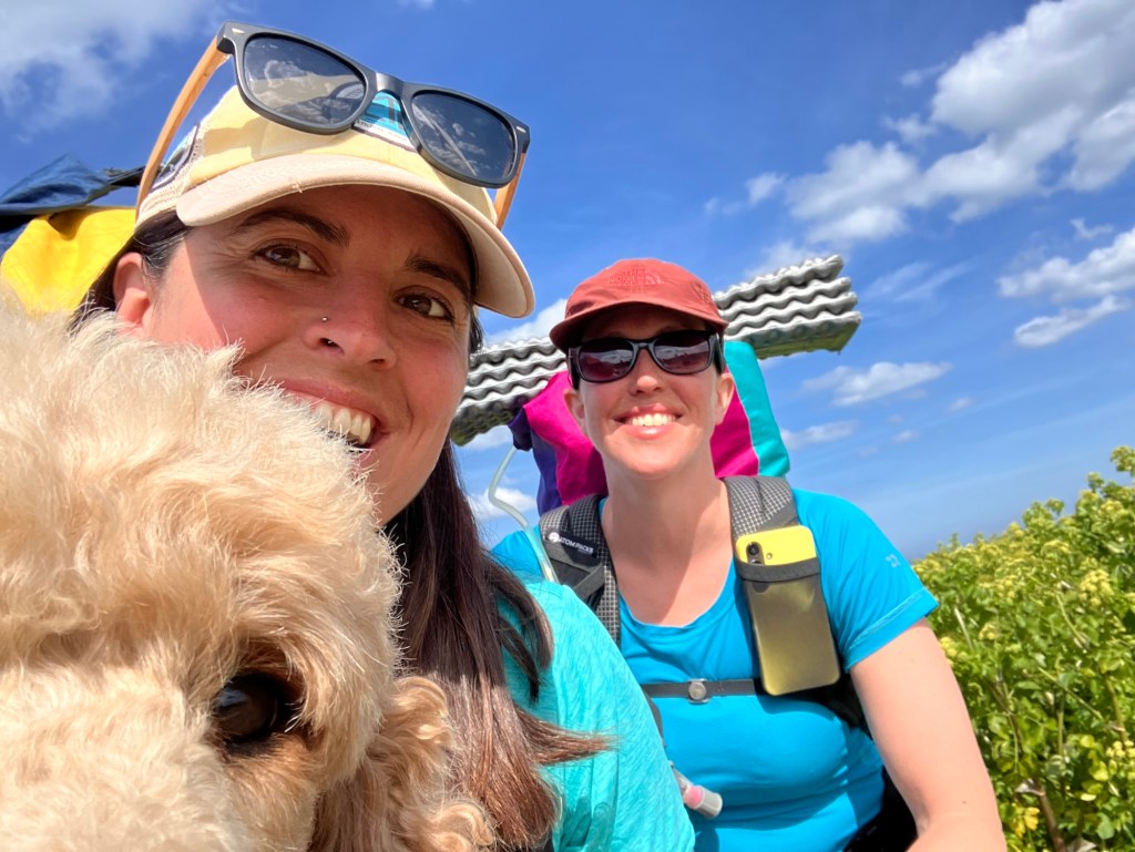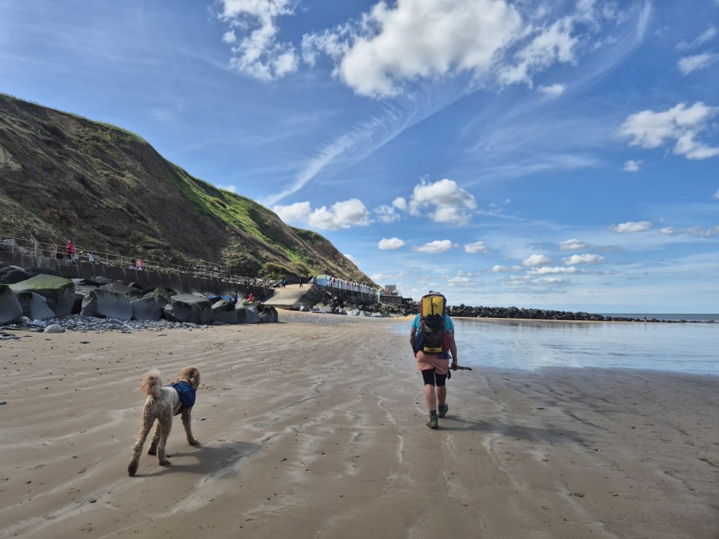 Refreshed now, we took to the hectic streets and crowded sea wall. Like any spot surrounded by amenities, you don’t have to travel far to loose the crowds. We headed for the beach and walked some way before realising we should be on the cliff tops. Back we went, back past the heroic Blue Tit ladies group fresh from their swim and back past all the people who remarked “isn’t it great that poodle carrying all his things” and “is she carrying all your stuff too?” And “isn’t he clever?” and “we’ve got a cocker poo”.
