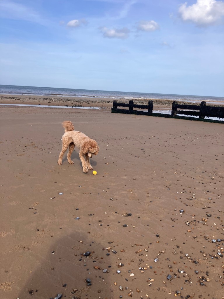 Down and onto the beach now, Eric is obsessed with the beach. Once those little toes hit sand she’s a little puppy again spinning, bounding about and getting a sandy little nose as she ferrets about the place. She’d found a ball, and entertaining her with this is an excellent way to stop her from inserting herself into another family who might not want an extremely over confident poodle presuming it’s ok to join in.