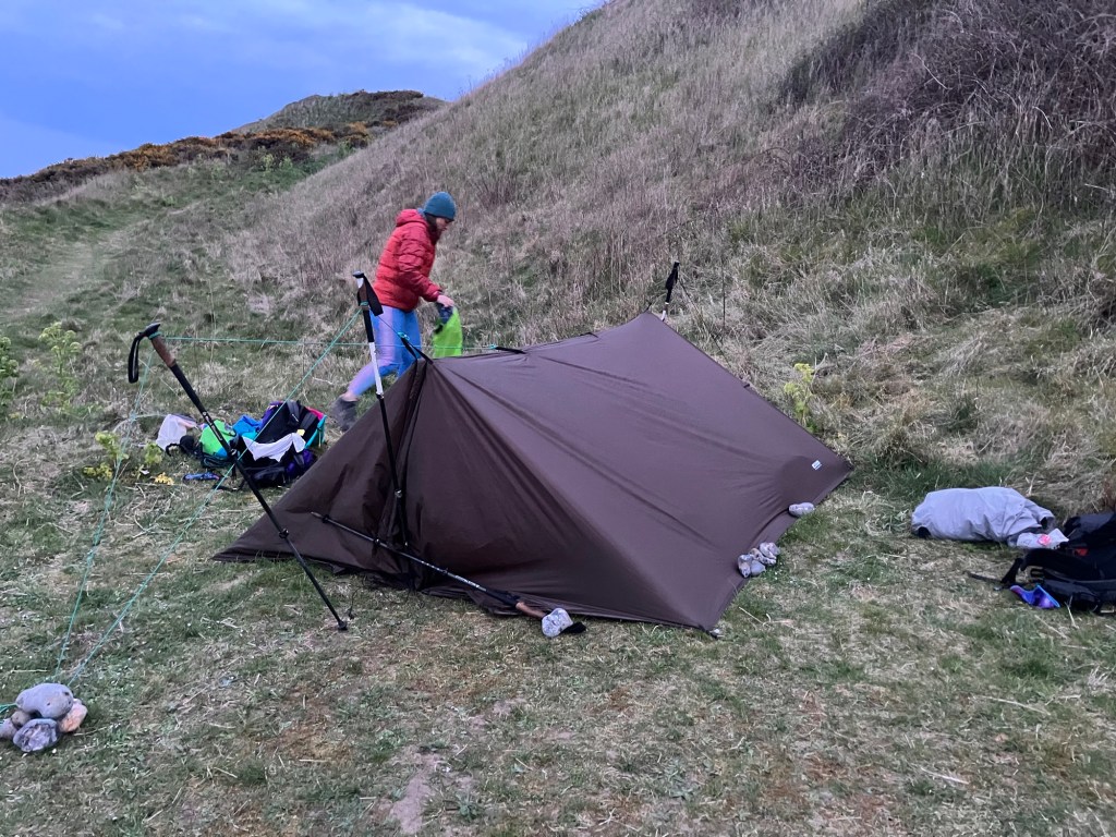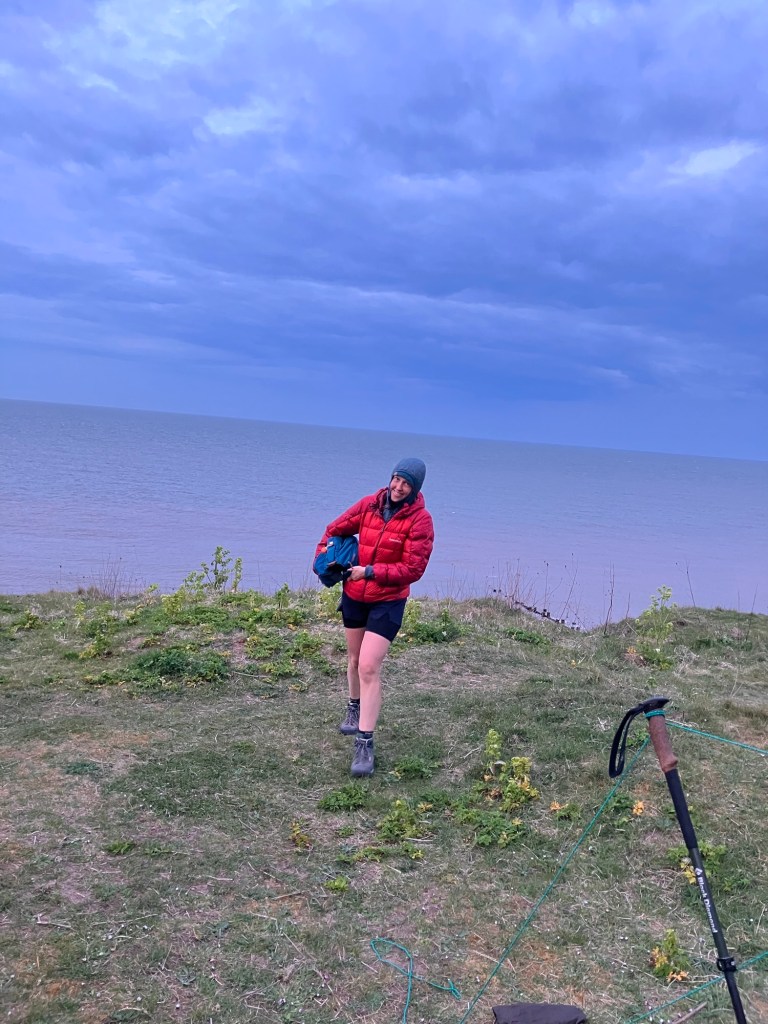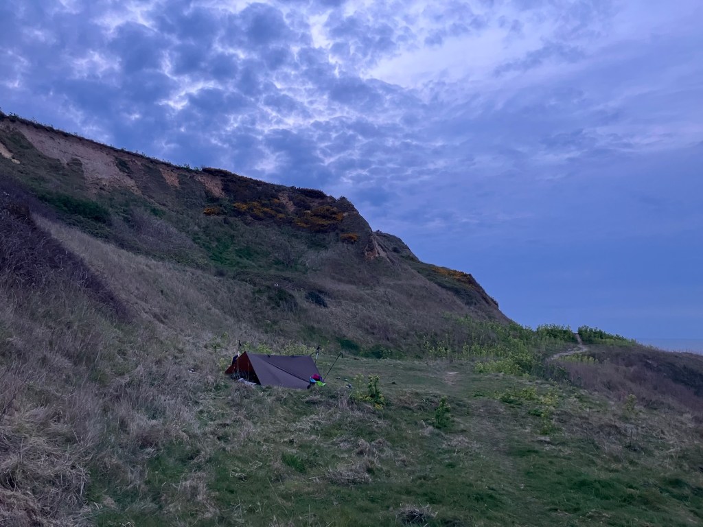 The cliff walk ahead was multiple back to back holiday parks- chances of pitching looked bleak, the campsite listed on Google in Mundesley was, we think, in reality a chalet farm. It was a good few miles out the other side and even after that it looked fairly difficult to pitch. We popped out onto the coast road and I peered over the edge – lo’ and behold a perfect flat ledge was beneath which looked like it was a known spot for campers.