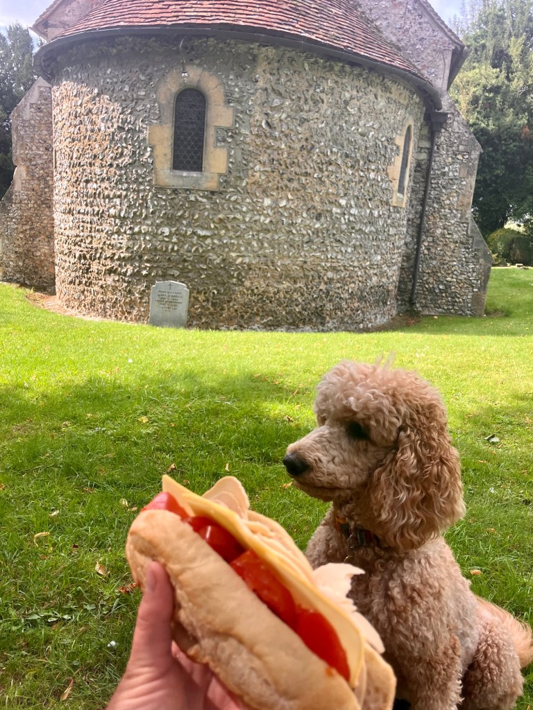 We walked on, up and over another steep ridge and before long we came to a bench surrounded by a church and a churchyard. Lovely. I filled my face with a mega baguette and Kai ate the sad little wrap he’d bought the day before. He must learn the hard way. We took off our shoes. Winnie had a tin of fish.