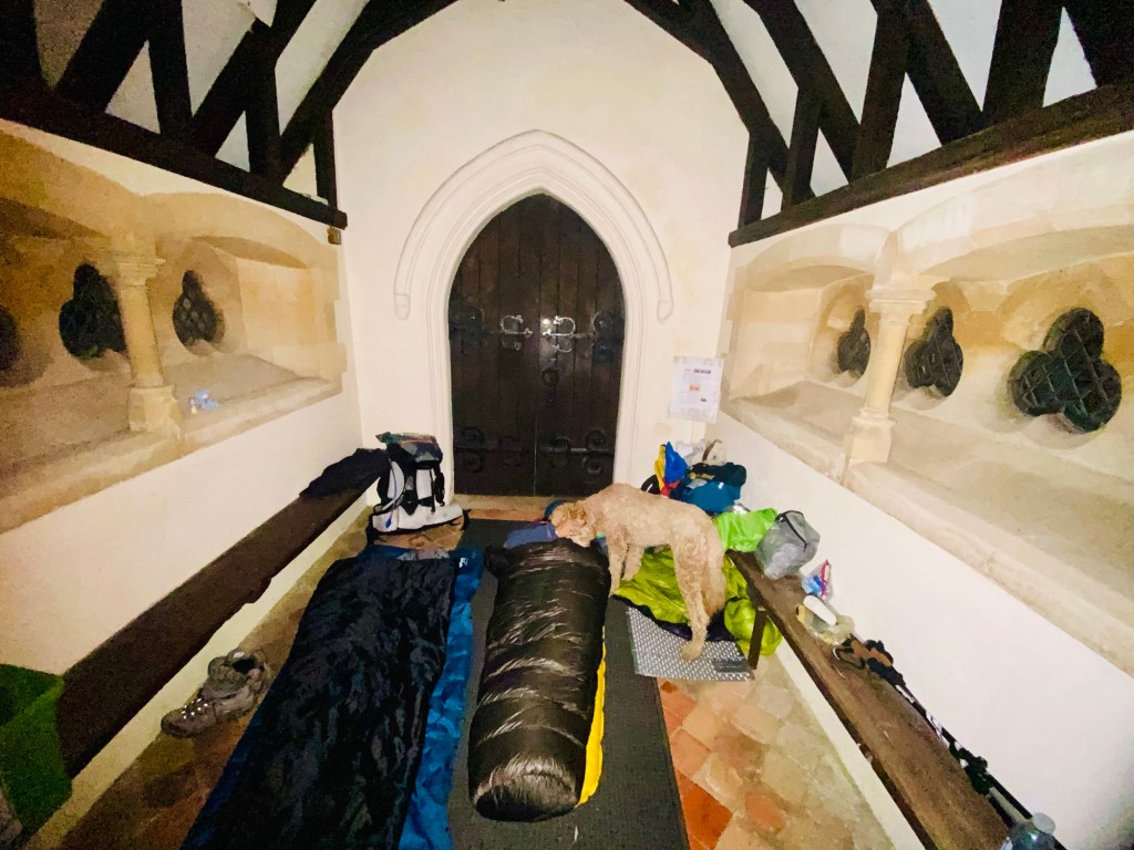 We made it by 6:30 – the church had a lovely porch, handily situated so as not to be seen from the road. The main door was locked which told us the warden had done his (it was a him) duty for the evening. The porch only had saloon gates, no outer doors, so we easily accessed the recess. We sat in silence on the pews until 7pm when we deemed it a suitable hour and suitable light to make the space our little home for the evening.