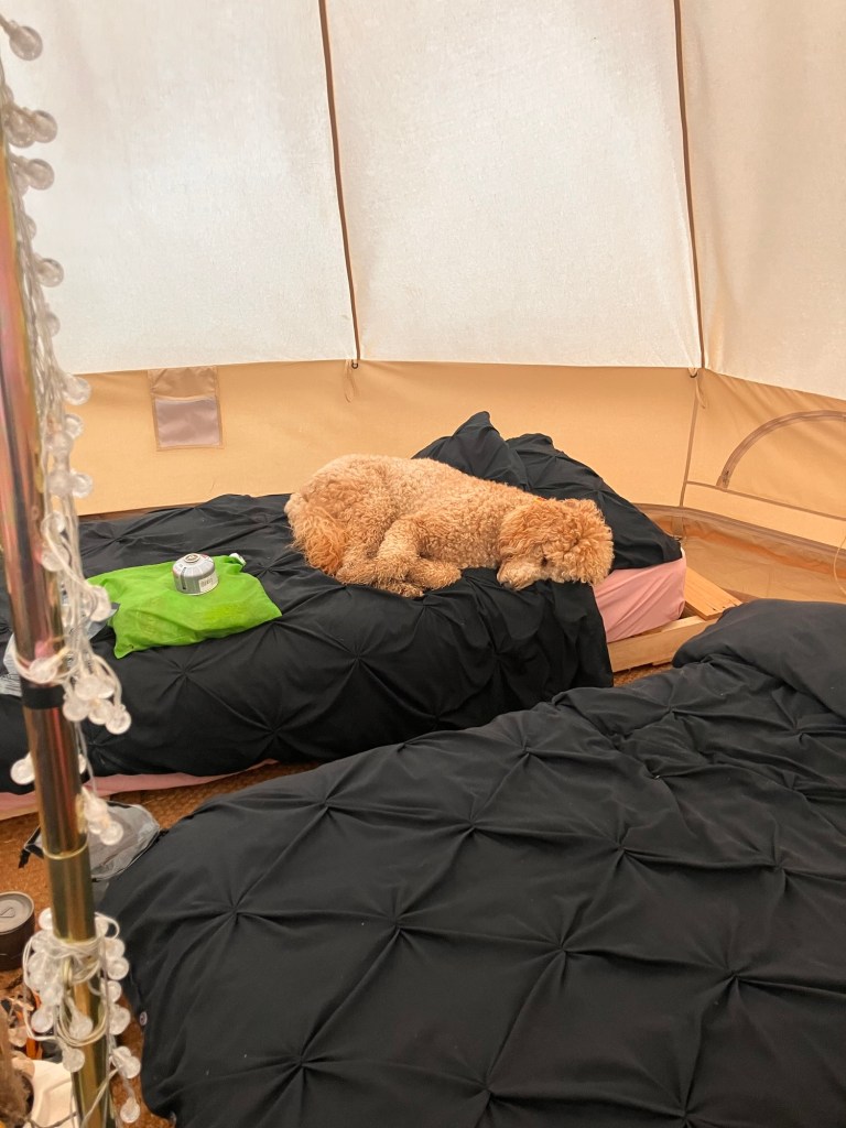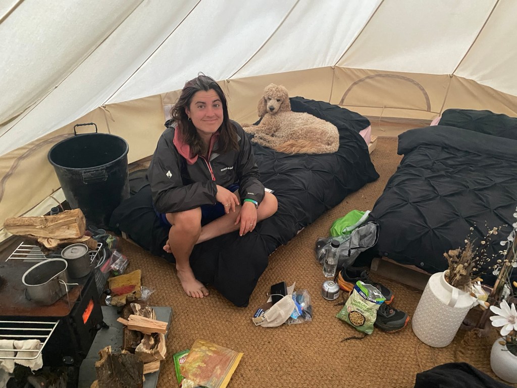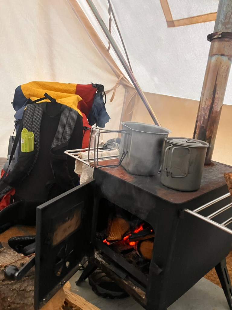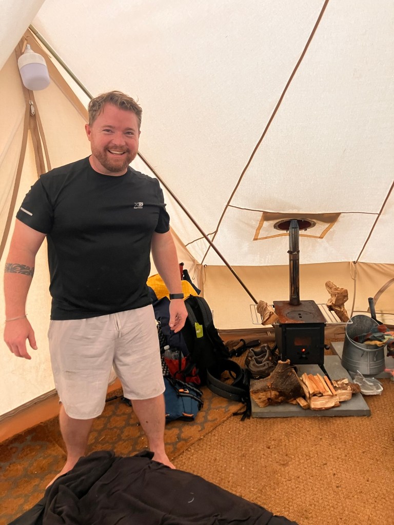 Once more we ventured off , brave as we are into the wind. 5 miles flew by with further ponder on where the pork van could be located and before long we met a junction on which we turned south to a small re-entrant in the hill which offered us a spot to camp for the night. It was a low moment arriving in rain and wind after 22 miles of a drizzly battering.We noticed that this ‘wild camp’ spot also offered bell tents with freshly made beds, so we made the difficult decision to sleep there instead.