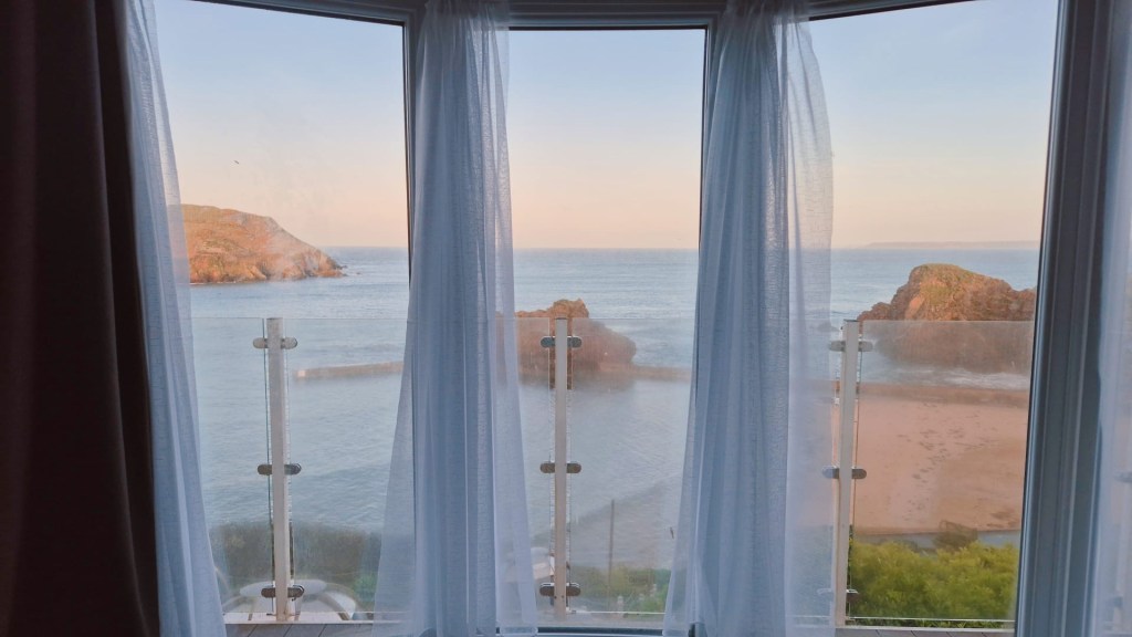 We woke to a sunny sea view out of our massive bay window and drank tea and ate biscuits while Groany put her face on.