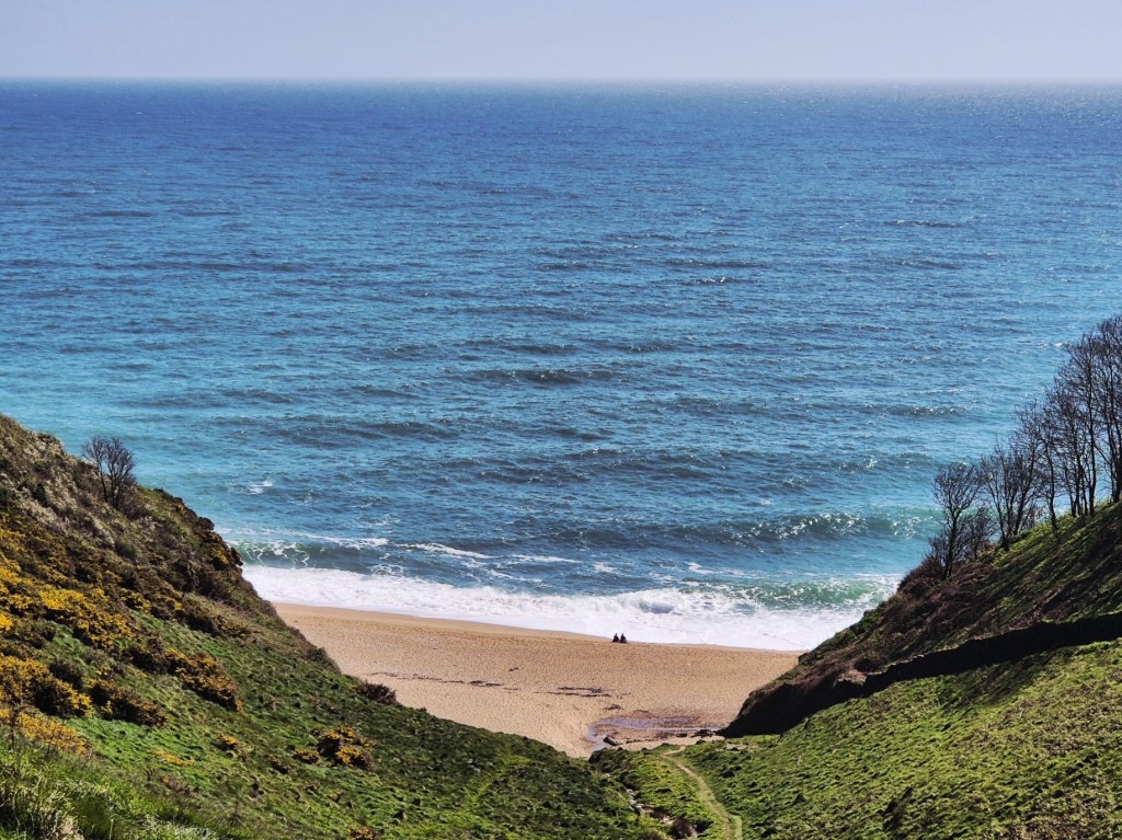 From here we climbed back up onto some cliff tops and undulated our way along a very different and much sandier coast. Little detours took us through dingle dells with the blue of the bluebells increasing by the day, three cornered leeks, primrose, alexanders, dog violet all bringing tasty vibrant colour to the springing hedgerows.